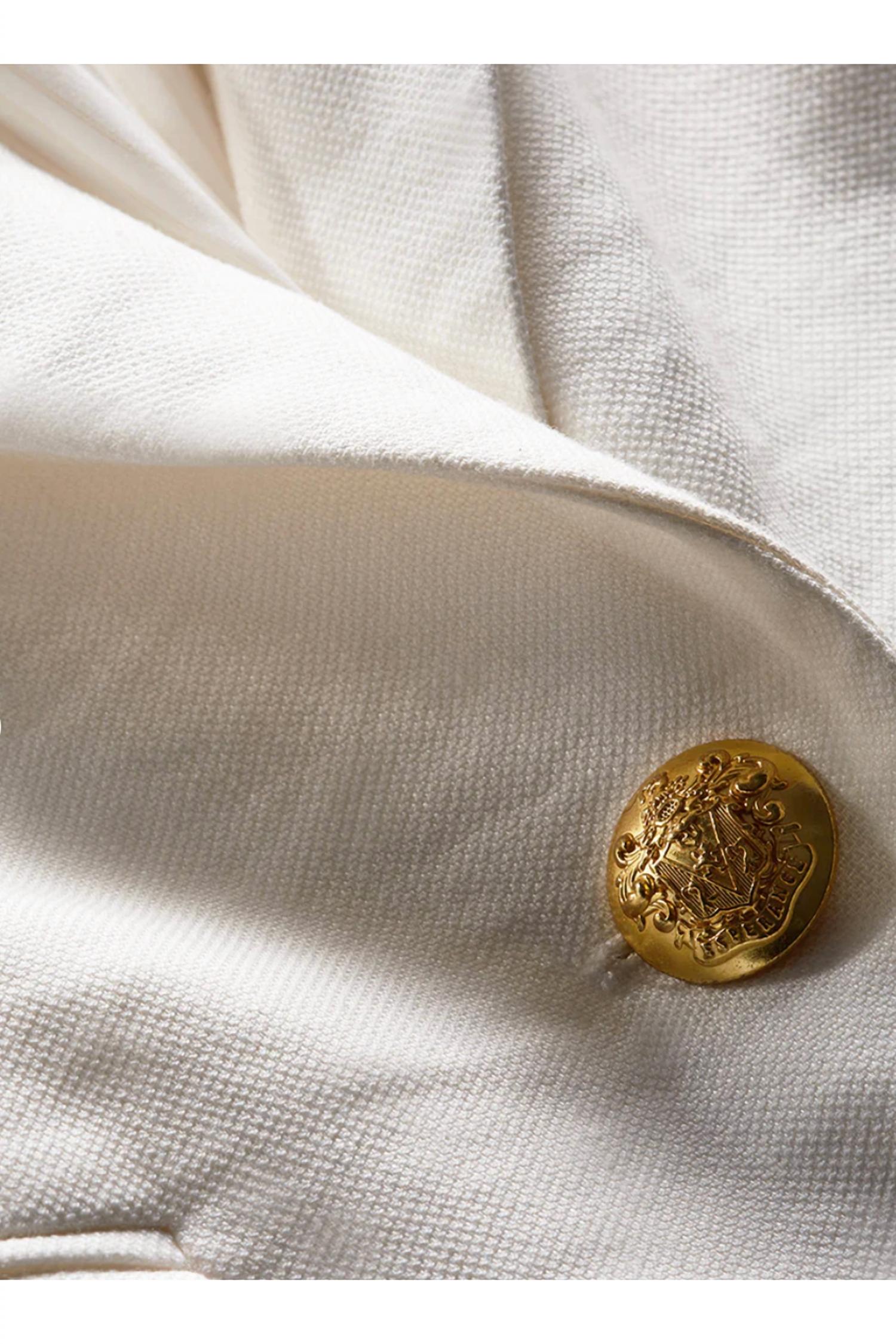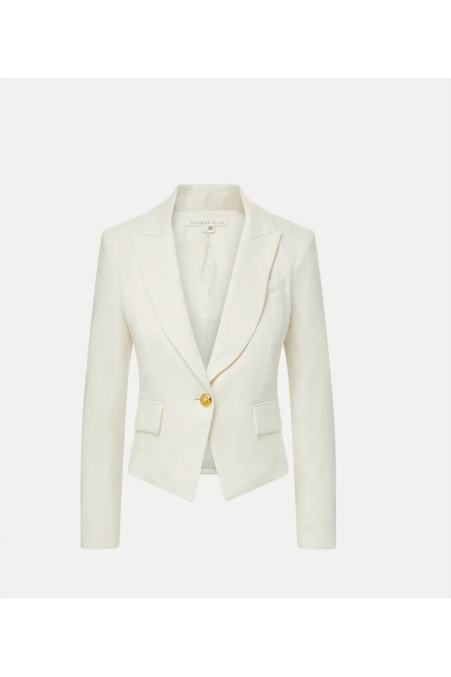 A blazer so versatile you can wear it to the office or pair it with jeans for a more casual look. Introducing the Hosanna Dickey Jacket by Veronica Beard, a timeless piece reimagined in a chic white linen blend. This classic jacket features long sleeves, a crisp notched lapel, and single-breasted button closure, offering a flattering silhouette with tailored seaming at the waist. Made in the USA with a composition of 58% linen, 27% polyester, 14% viscose, and 1% elastane, it ensures a comfortable and stylish fit. Elevate your wardrobe with this versatile jacket, perfect for everything from dinner parties to Thanksgiving gatherings. Care: Professional dry clean only.
