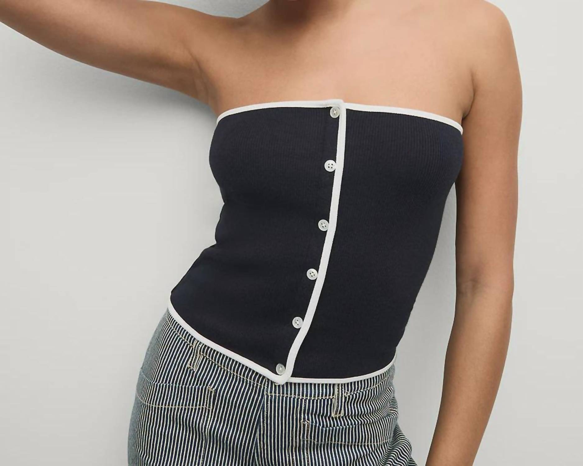 This classic tank top is perfect for layering and cute enough to wear on its own. Introducing the Strapless Button Top by Veronica Beard, designed for a sleek and modern look. This tube top, crafted from a soft stretch cotton blend, features a strapless sleeve design and contrast-color piping for a distinctive preppy edge. Ideal for summer cocktail parties, it can be worn solo or layered for versatile styling. Care: Machine wash.