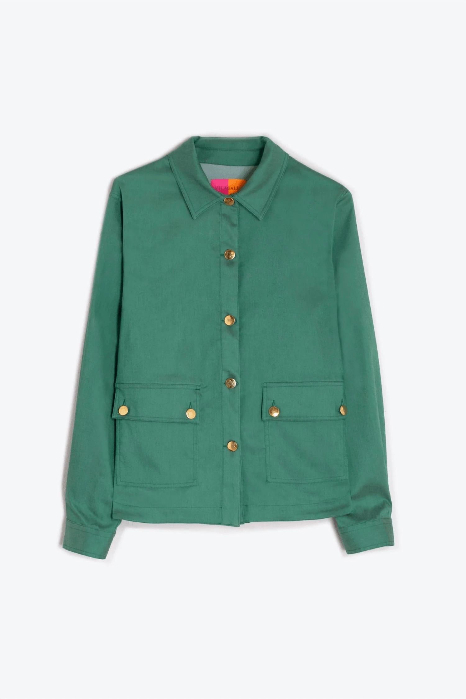 A casual yet cool jacket that every closset needs. Discover the Olivia Jacket by Vilagallo, an eye-catching fusion of style and versatility. This long sleeve jacket is crafted from a cotton blend composition of 70% cotton, 27% polyester, and 3% elastane. It features a green overshirt design with a striking back of blue and white stripes, adorned with embroidered sequin flowers. Closure is achieved with gold star buttons, and it includes practical front pockets with button fastening. Care: Machine wash.
