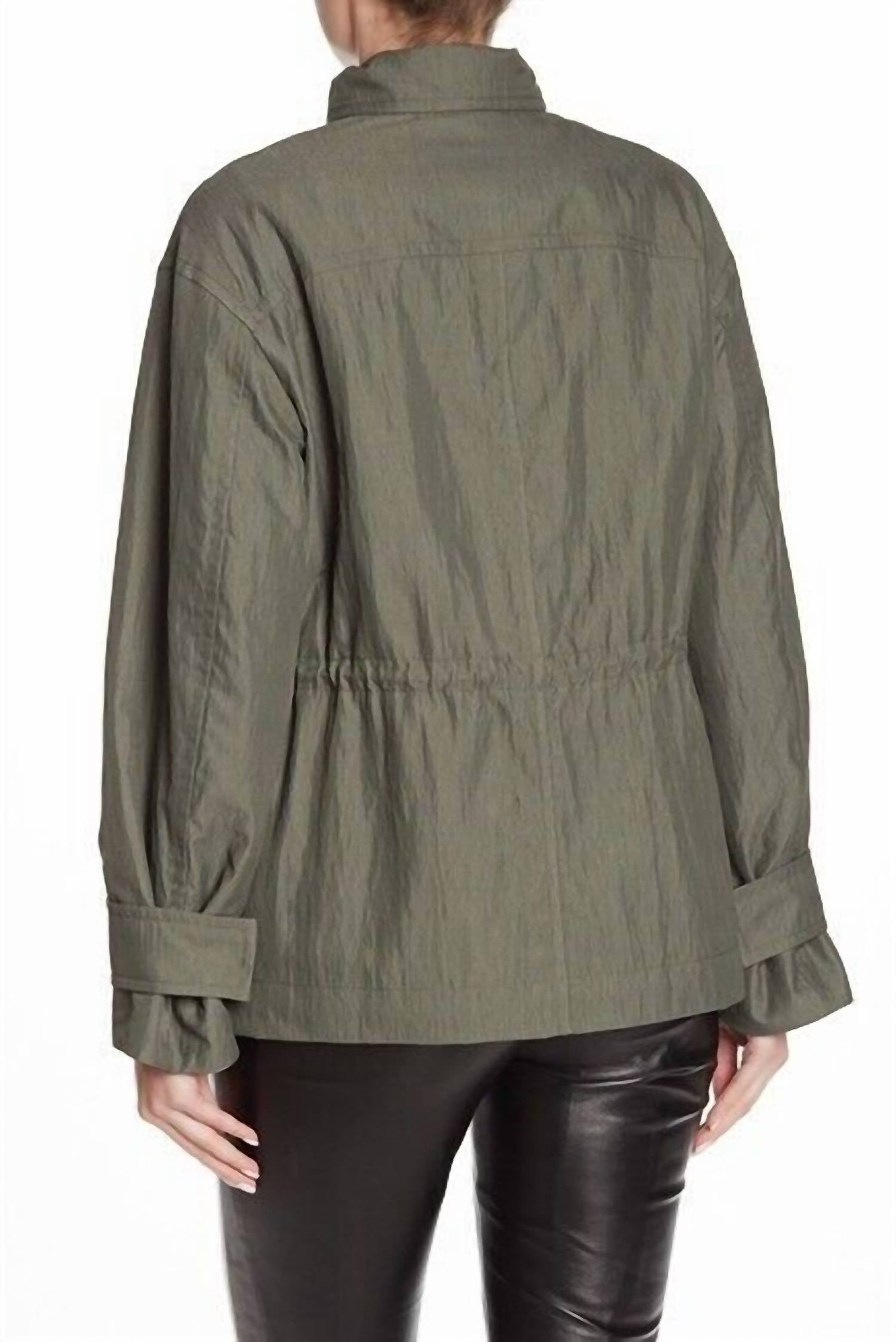 The coolest, most versatile utility jacket. Match it with your favorite pair of denim or throw it over any day dress. Introducing the Women's Flap Pockets Drawstring Anorak Jacket by Vince, a perfect blend of functionality and style. With long sleeves adorned with belted snap cuffs, this jacket ensures comfort and adaptability through its front snap button placket with zip closure and interior drawcord waist. The composition includes a shell of 51% polyester and 49% nylon with a quilted lining, providing warmth and quality craftsmanship. Measuring 26.5" in length with dimensions of shoulder 19" and chest 20.5", this green utility jacket promises a true-to-size fit, making it a versatile staple for any wardrobe. Machine washable for effortless care.