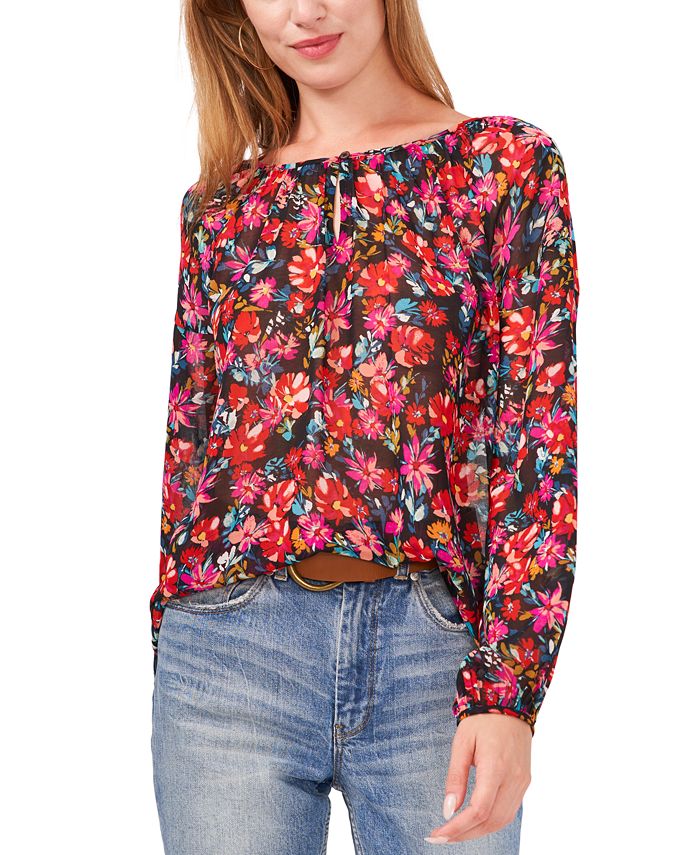 Floral refresh; rock the boho-chic vibe in this fun| floral peasant top by Vince Camuto.| Approx. 24-1/2 long| Scoop neckline| Button closure at neck | Keyhole detail
