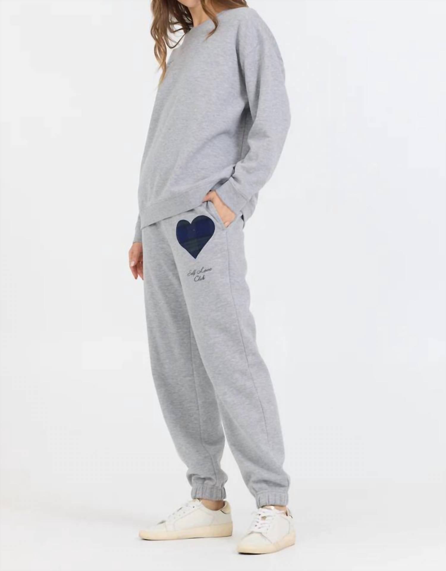 No gym necessary for these cool-girl joggers. Elastic waist jogger with self love club logo and heart patch