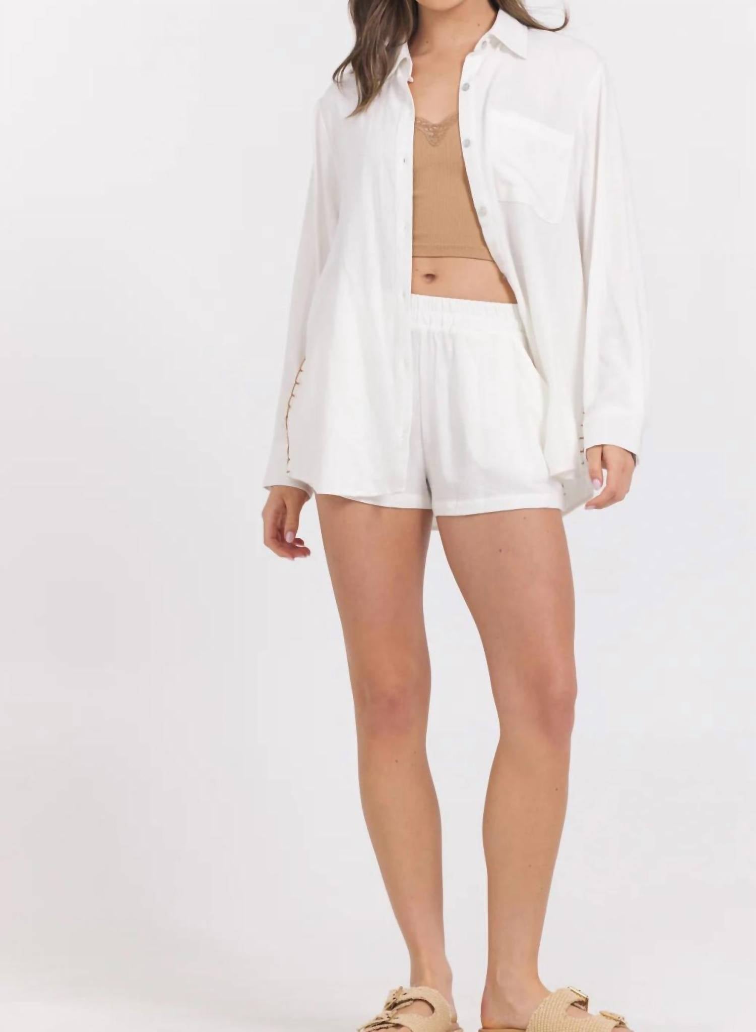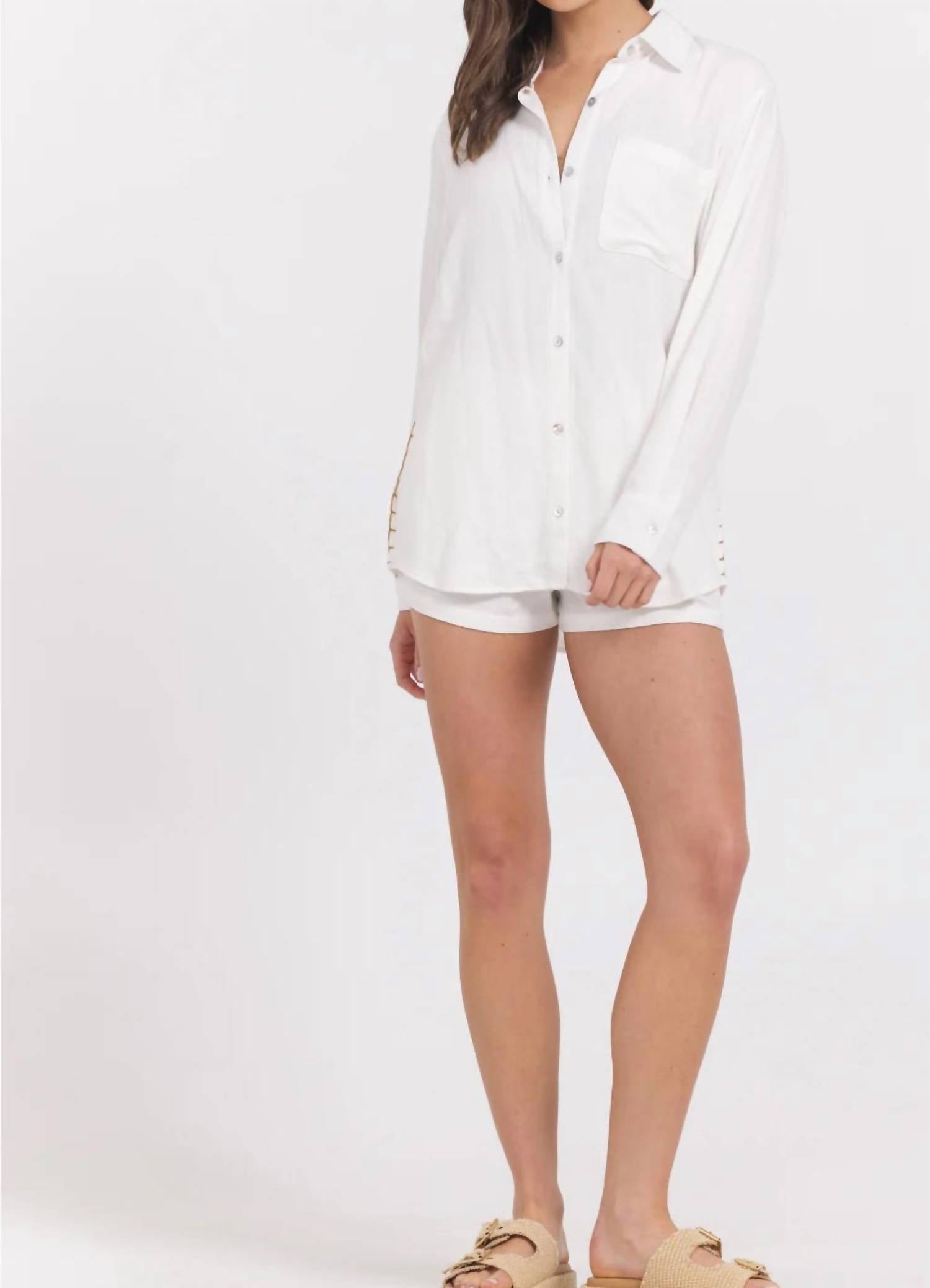 Great fit, cute design, soft fabric. You'll love everything about this long sleeve tee. Elevate your travel wardrobe with the Printed Washed Button Down Shirt by Vintage Havana, perfect for a spring getaway. This long sleeve top in breezy white features a lightweight blend of 85% viscose and 15% linen, highlighted with a graphic design of iconic beach destinations. It’s crafted with a button closure, a practical front pocket, and stylish side lace-up details for a relaxed fit. Care is a breeze with machine wash instructions, making it an ideal choice for effortless streetwear style.