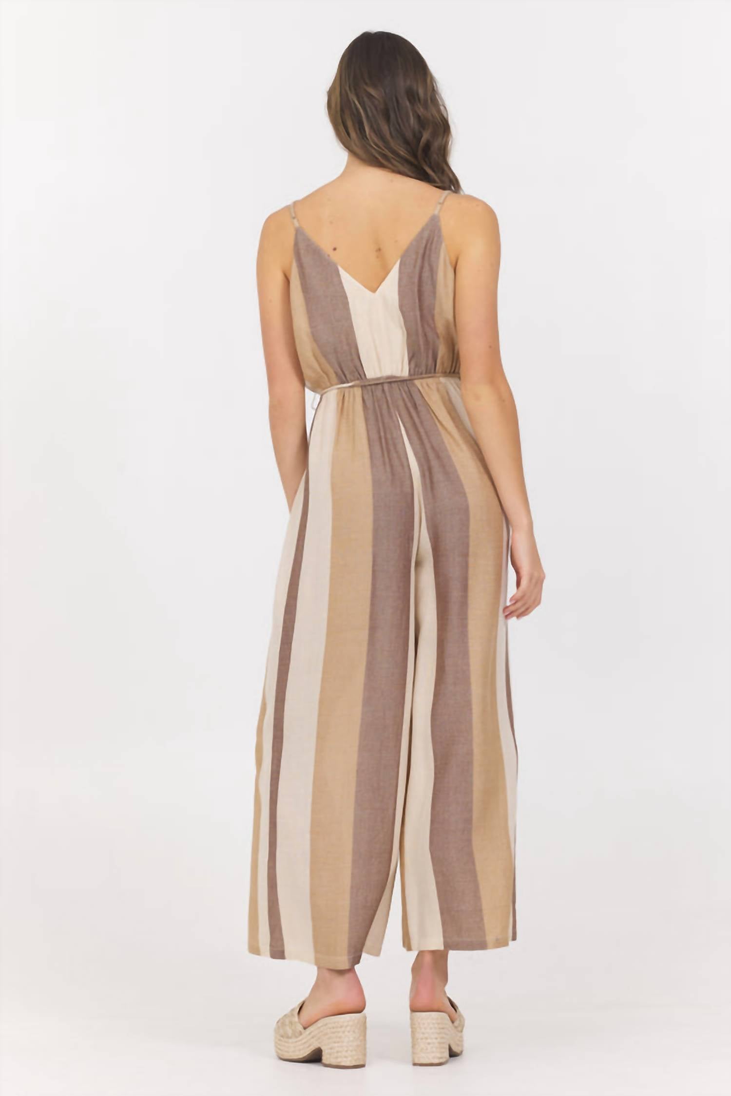 Throw it on and go! Enhance your summer wardrobe with the Stripe Metallic Jumpsuit by Vintage Havana in a chic Coco color. This boho chic jumpsuit features a wide-leg silhouette with subtle stripe styling, perfect for both day and night occasions. Its flowing design is both breathable and stylish, embodying modern flair with timeless appeal. Originating without a specified country, this piece promises a polished, effortless look for women this season.