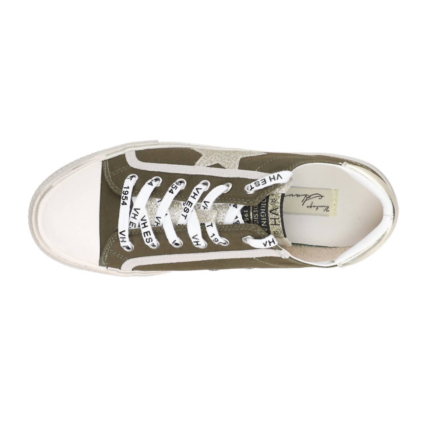 Step into retro elegance with the Women's Alive 34 Sneakers by Vintage Havana, crafted in a stylish Olive Gold. These sneakers feature a canvas and leather upper, providing a chic yet durable exterior. The slip-on style ensures effortless wear, complemented by a synthetic lining and insole for comfort. Designed with a traction signature and rubber outsole for reliable grip, they fit true to size and promise to seamlessly blend into any streetwear ensemble.