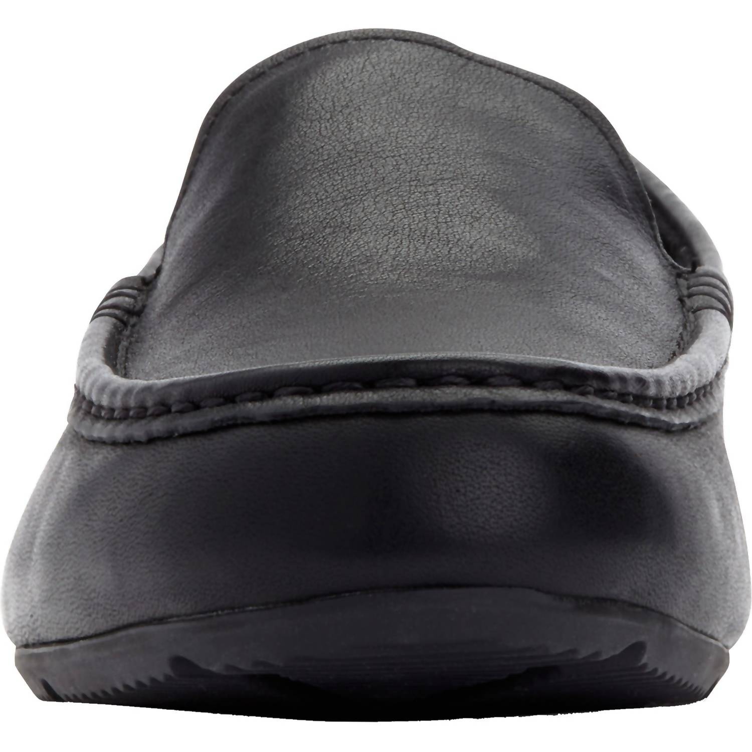 Step into unparalleled comfort and sleek design with the MEN'S BOROUGH TOMKIN MOC SHOES by VIONIC. These slip-on loafers feature a luxurious leather upper in a classic black shade. Enjoy the plush support of a removable faux-shearling covered EVA footbed, biomechanically crafted to hug your arches for natural alignment. Finished with durable rubber outsoles and round toes, these shoes are perfect for adults seeking both style and function in medium width, with a flat heel under 1".