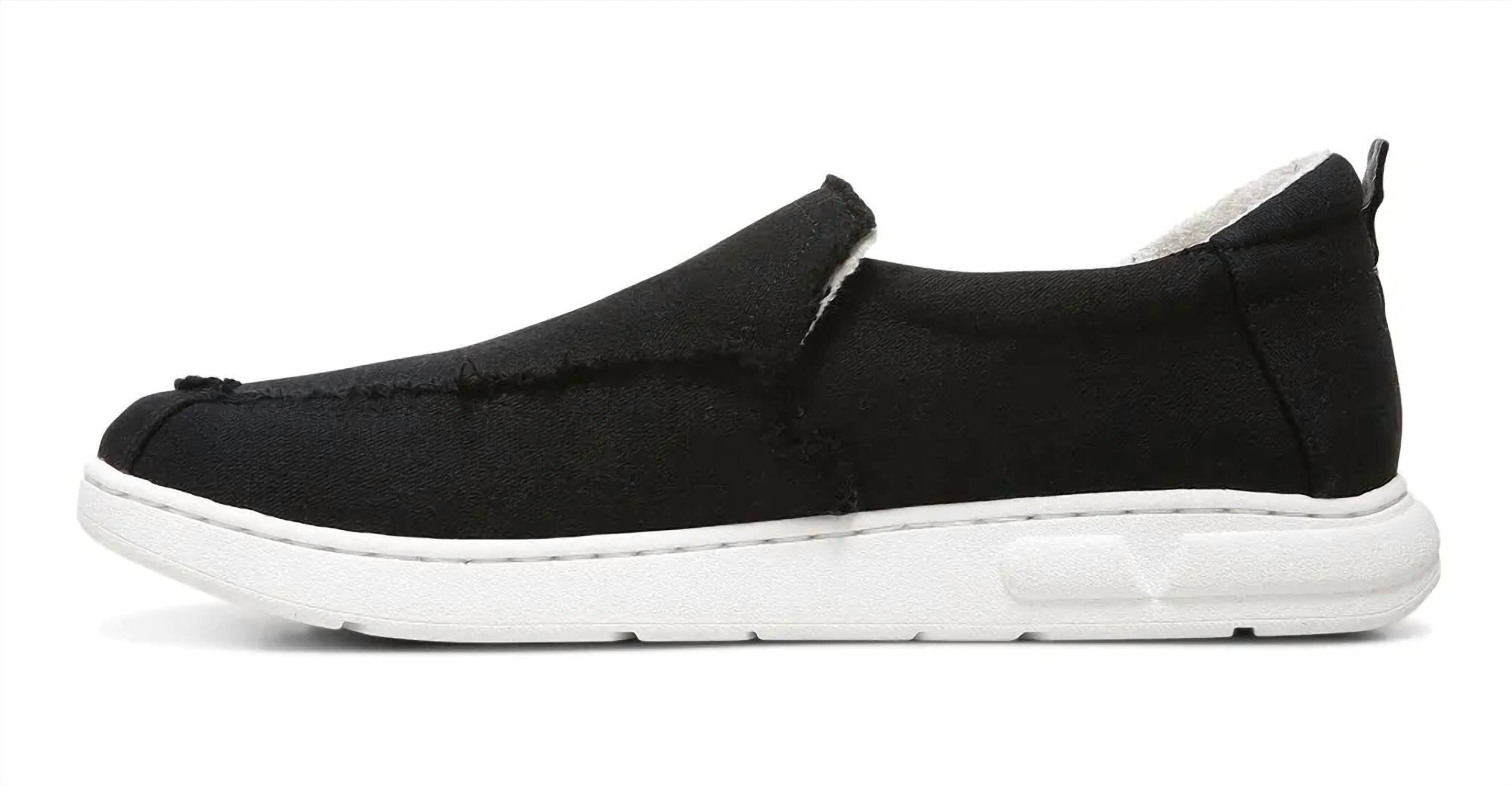 Discover the MEN'S SEAVIEW CANVAS SLIP-ON SHOES by VIONIC, perfect for effortlessly casual and summer outings. The eco-conscious design features an eco-certified cotton canvas upper, offering both style and sustainability in a leather-free option. These shoes boast a lightweight TPR outsole for superior comfort along with a removable twill-covered EVA footbed for enhanced arch support. Easy to maintain, simply machine wash in cold water after removing the orthotic footbed and air dry to keep them looking fresh. Toe Shape: Round Toe. Shoe Width: Medium.