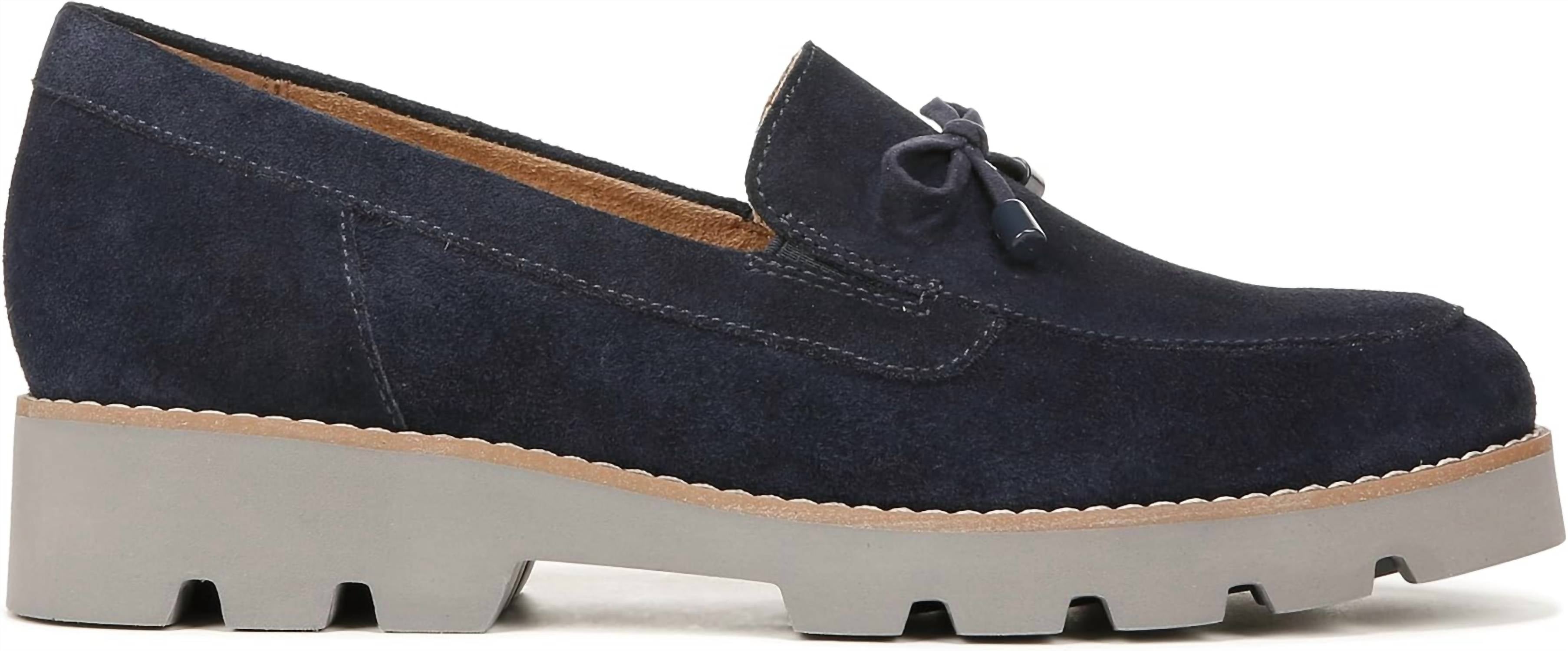A preppy yet feminine take on the classic loafer. Meet the VIONIC Women's Finley Suede Bow Loafers, a perfect blend of style and comfort in a sophisticated Navy finish. These round-toe, platform heel loafers feature a suede upper and lightweight EVA insert for comfort, combined with a durable synthetic outsole ensuring long-lasting wear. Recognized by the American Podiatric Medical Association, they incorporate Vionic's Vio Motion Technology, offering stability, arch support, and cushioning to alleviate heel pain.