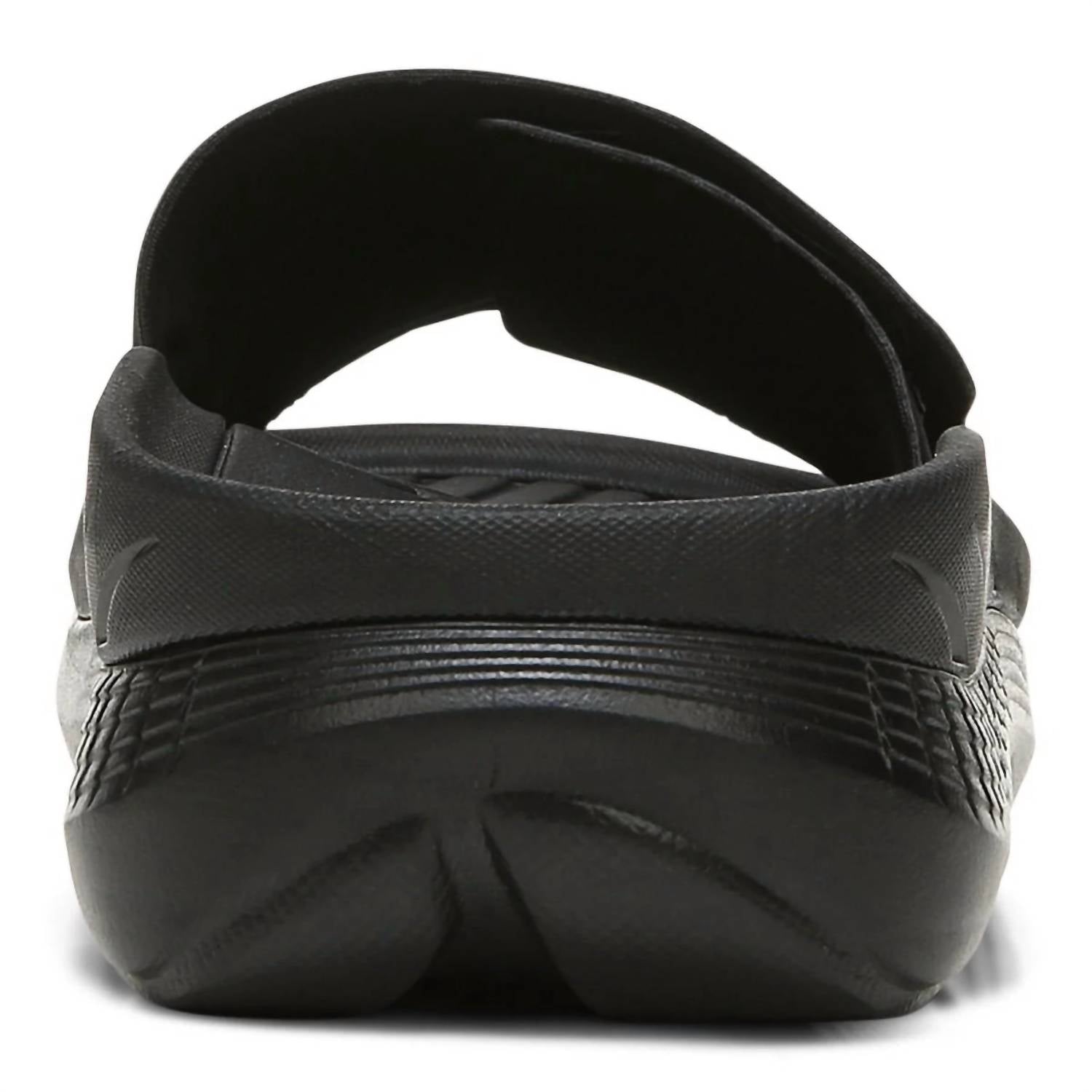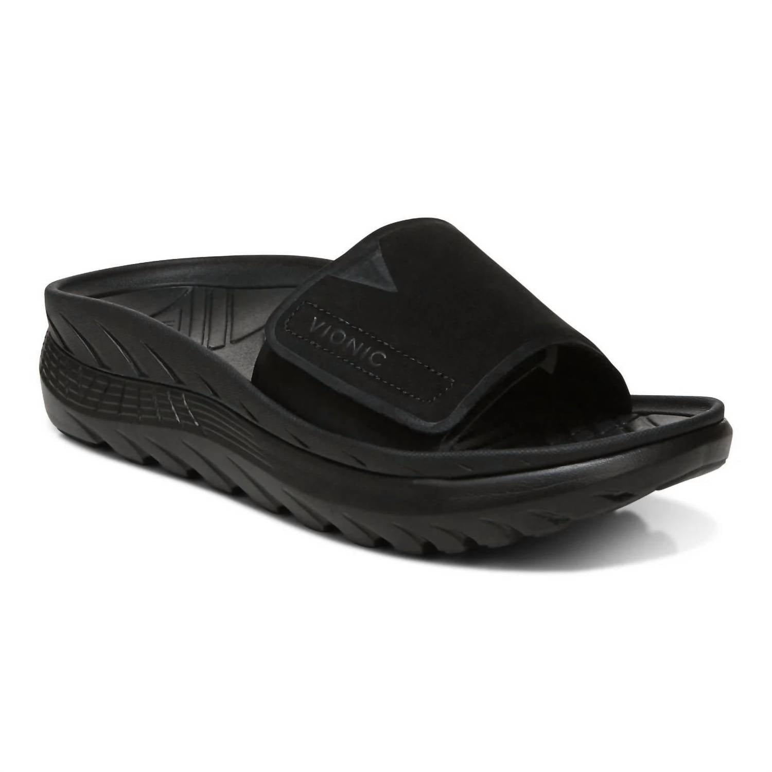 The Women's Rejuvenate Recovery Sandal by VIONIC in Black Black is designed to relieve your feet after a long day. With adjustable straps and a texturized footbed, this sandal provides customized comfort and massaging relief. Its dual-density midsole and molded EVA footbed with a deep heel cup ensure superior support and dynamic stability. Heel height: 2 inches. Ideal for travel and athleisure trends, this sandal suits the spring season perfectly.