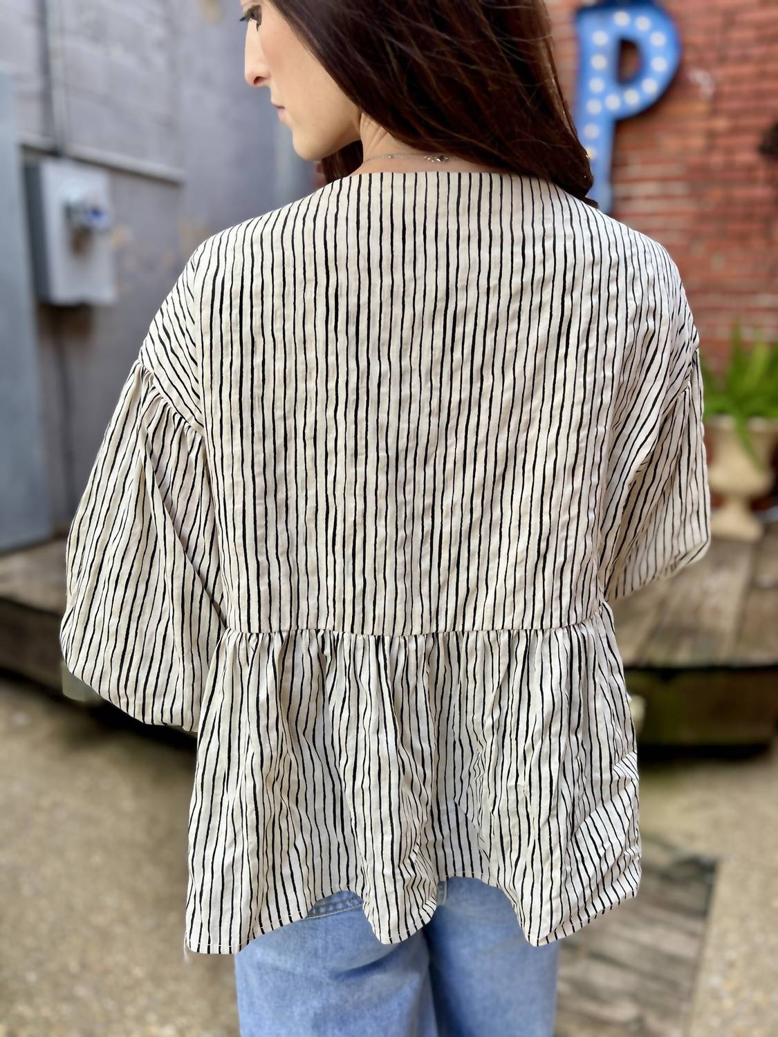 Introducing the "It's Your Turn Blouse" by WISHLIST, a sand-hued striped treasure sure to elevate your wardrobe. This women's blouse is crafted from a comfy cotton blend and features long balloon sleeves for a chic silhouette. Designed with a flattering V-neck, it's a versatile piece perfect for both workwear and special occasions. With a pull-on closure, it offers effortless wearability. Care: Machine wash. Model Shari, standing at 5’4”, is wearing a size small.