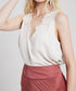 This Satin Lace Trimmed Top by WISHLIST is a chic addition to any wardrobe with its solid cream hue and delicate lace detailing. The sleeveless design is complemented by a flattering V-neckline, bringing elegance and versatility. Closure: Pull-on style for easy wear. Perfect for both day and nighttime outfits.