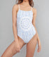 Elevate your swimwear collection with the Square-neck One Piece Swimsuit by WOLVEN in the Aquarius design. This stylish one piece features adjustable straps and a mid-coverage bottom, crafted from recycled materials comprising 84% RPET and 16% spandex, making it a sustainable choice. It boasts a reversible design from a serene mandala print to a solid white, and comes with quick-drying and odor-resistant properties. For care, it's machine washable and requires line drying. Gayeanne models the small size, true to fit.