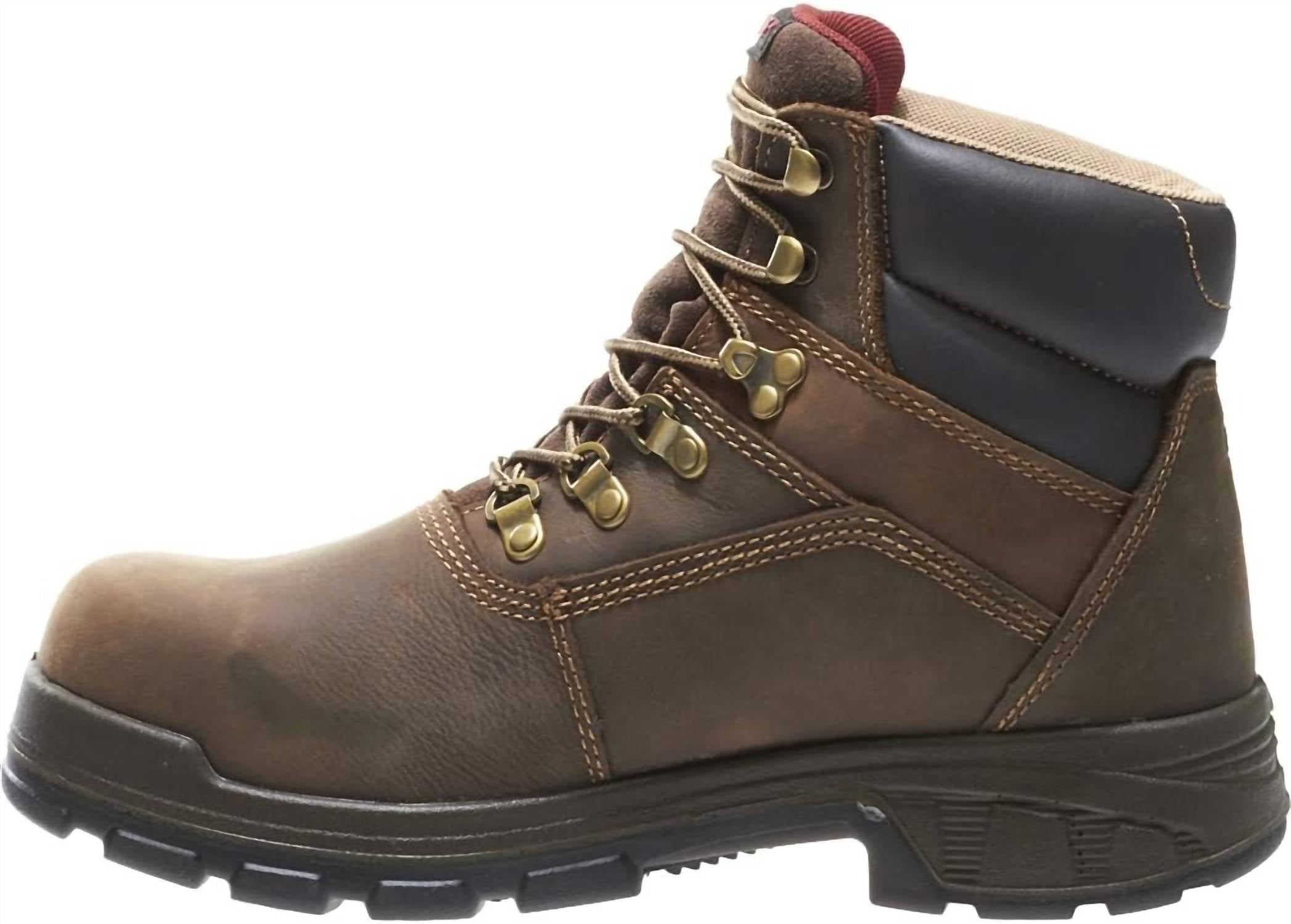 Introducing the Men's Cabor Waterproof 6" Soft Work Boots by Wolverine, crafted for durability in Dark Coffee leather. These work boots feature a waterproof leather upper paired with a PC Dry membrane to keep feet dry, while the wave mesh lining ensures moisture is pulled away from the foot for added comfort. Designed with a fatigue-fighting EPX™ footbed, nylon shank, and polyurethane midsole, these boots provide exceptional support and protection. The slip-resistant rubber lug outsole and direct-attach construction enhance water resistance, backed by Wolverine's 30-day comfort guarantee, ensuring they are a reliable choice for the adult male worker seeking comfort and stability.