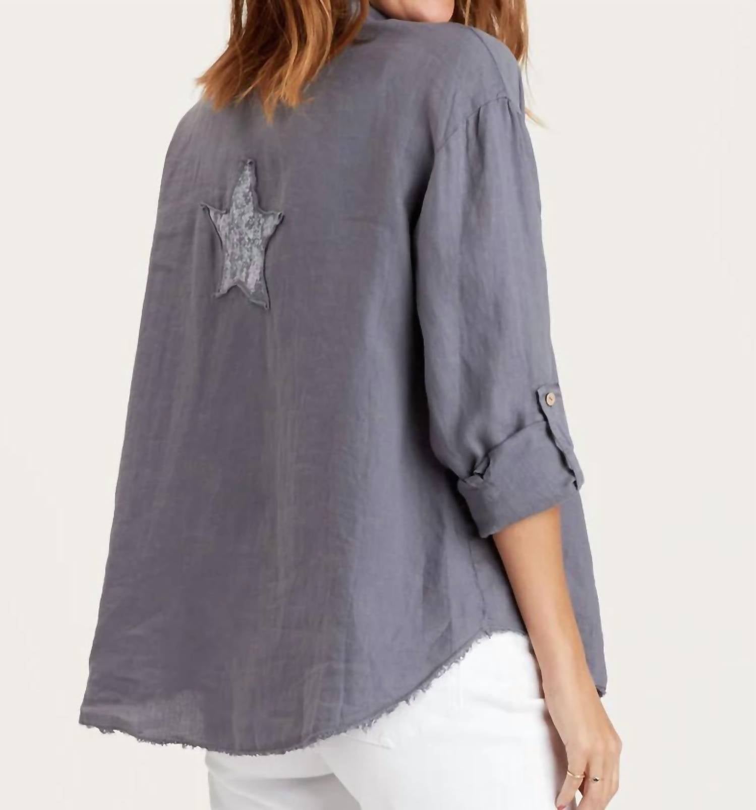 Perfectly tailored and soft to the touch. Patched and distressed, Babin Button-Up has a screen printed star stitched to the center back of this roll-up sleeve boyfriend shirt.Light Linen: 100% Linen.Center Front: ~22.25"Center Back: ~27"Preshrunk.Machine washable.Imported.
