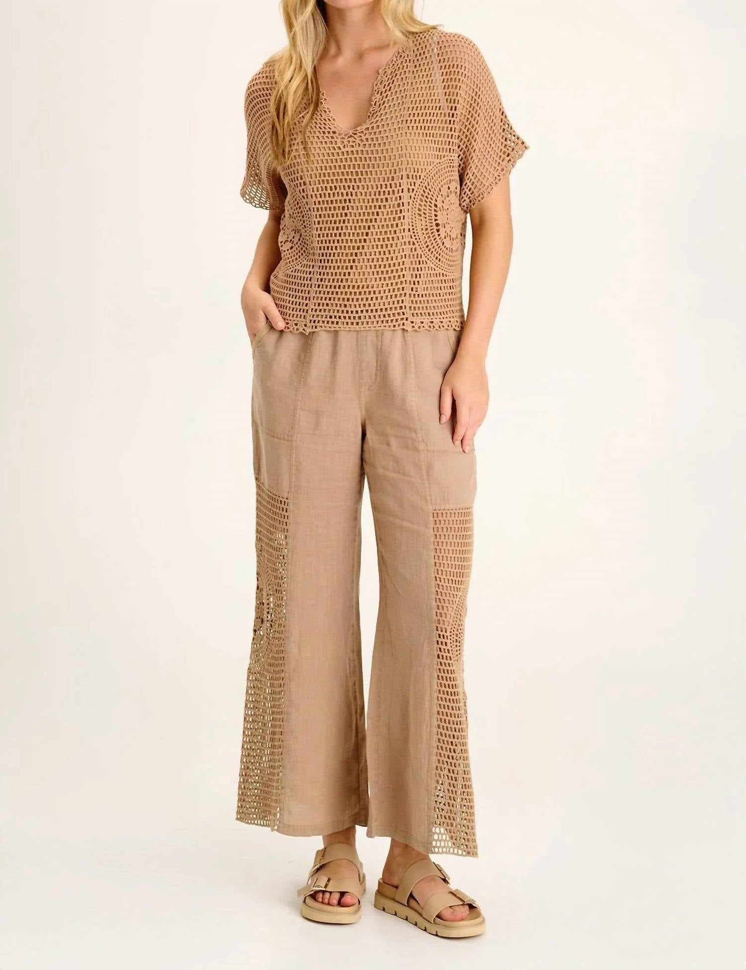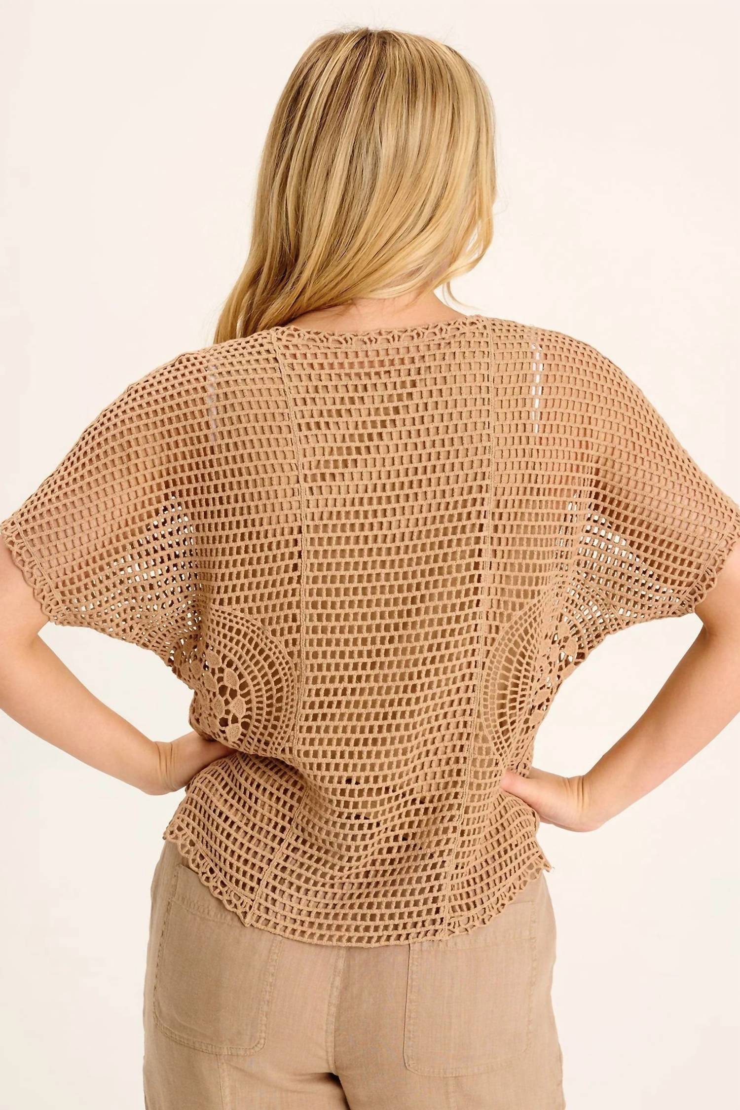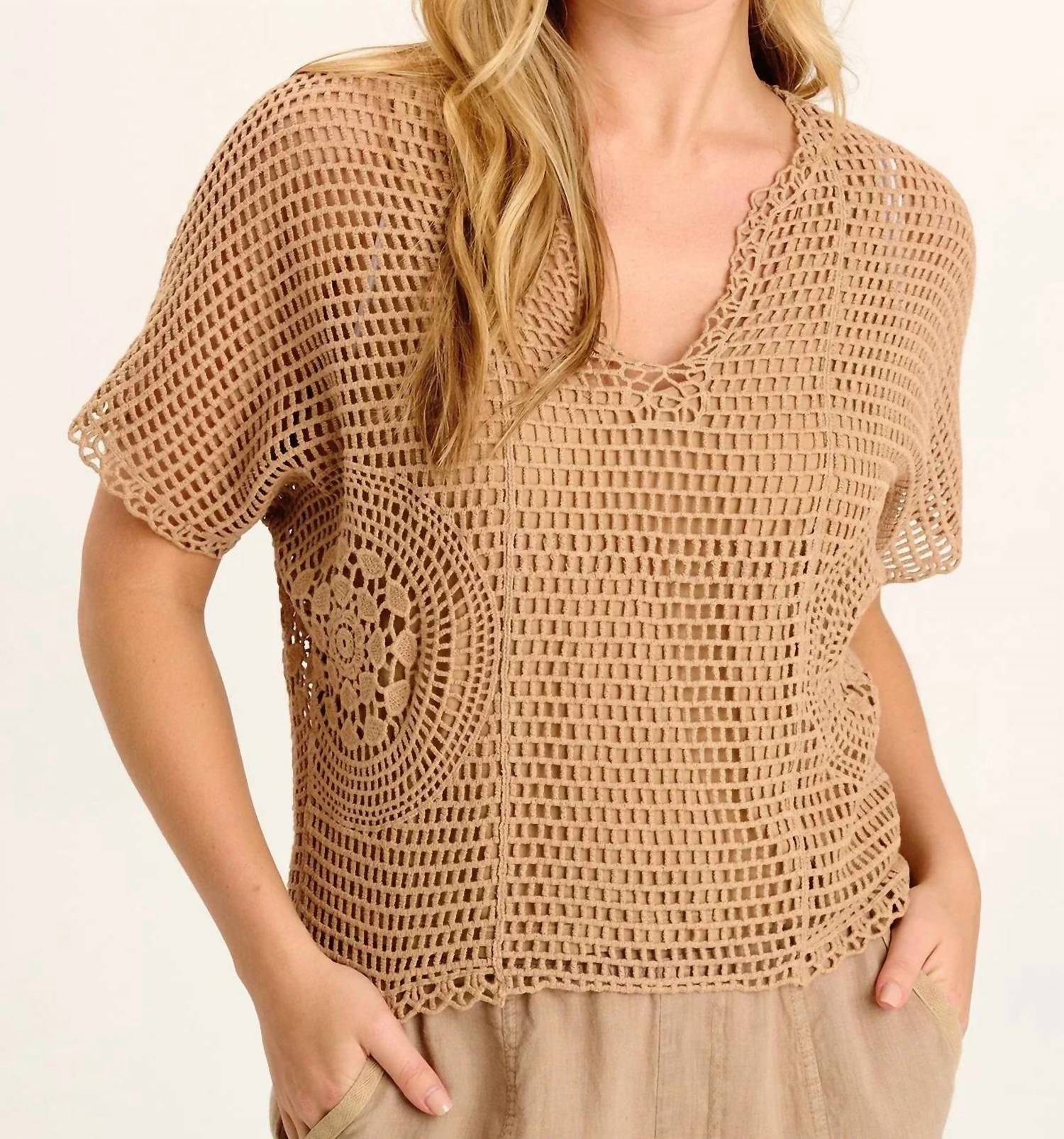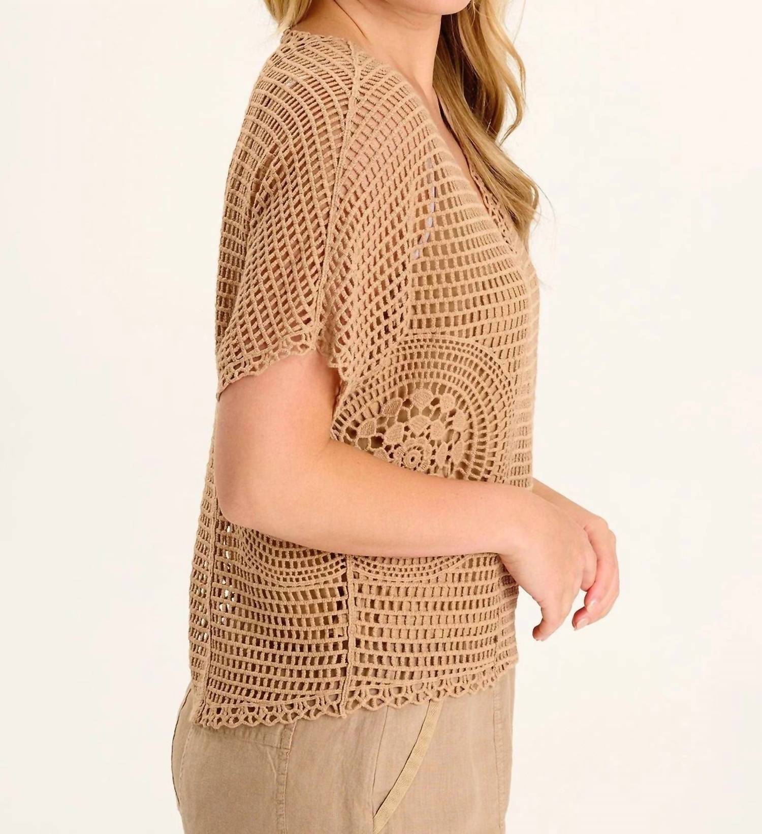 Warm yellow beige crochet delight that combines style with comfort. Short sleeve top features a decorative V-neckline and is highlighted by a circular crochet design along the side seams. Crafted from 100% cotton with a cotton jersey lining and measures approximately 22.5 inches at the center back. Perfectly preshrunk for a consistent fit. Machine washable for effortless care.