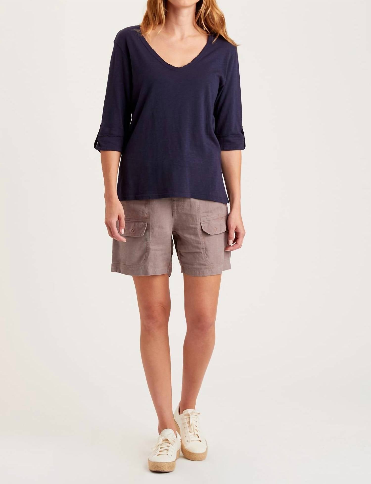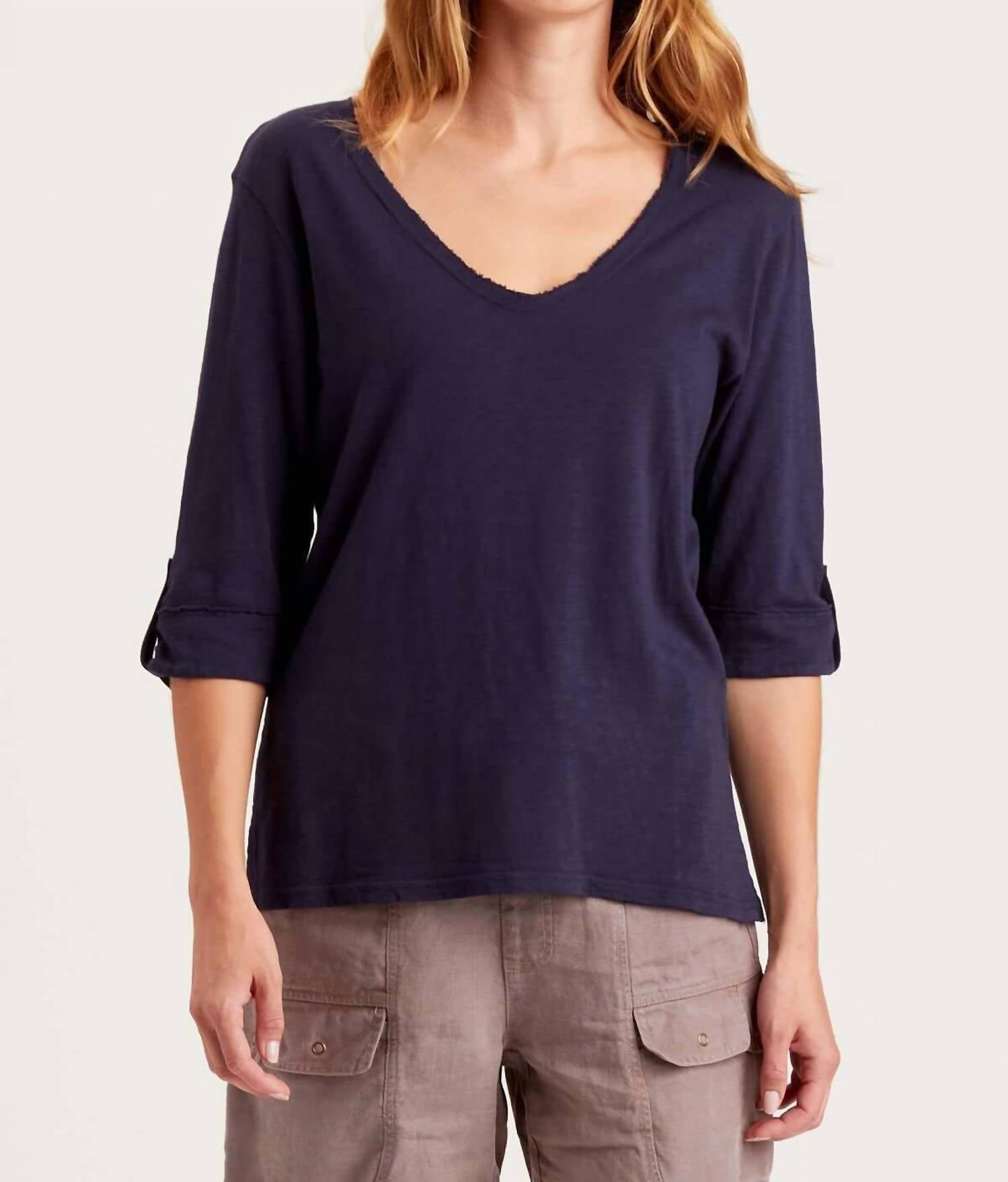Introducing the Christabel Top by XCVI, a must-have in solid navy for a polished yet casual look. This women's piece features three-quarter sleeves with snap and tab accents, crafted from a soft cotton blend of 60% cotton and 40% modal. Designed with raw edges and side splits, it offers a relaxed, carefree style with a gentle V-neckline. Closure: Pull On. Care: Preshrunk and machine wash, for easy maintenance.