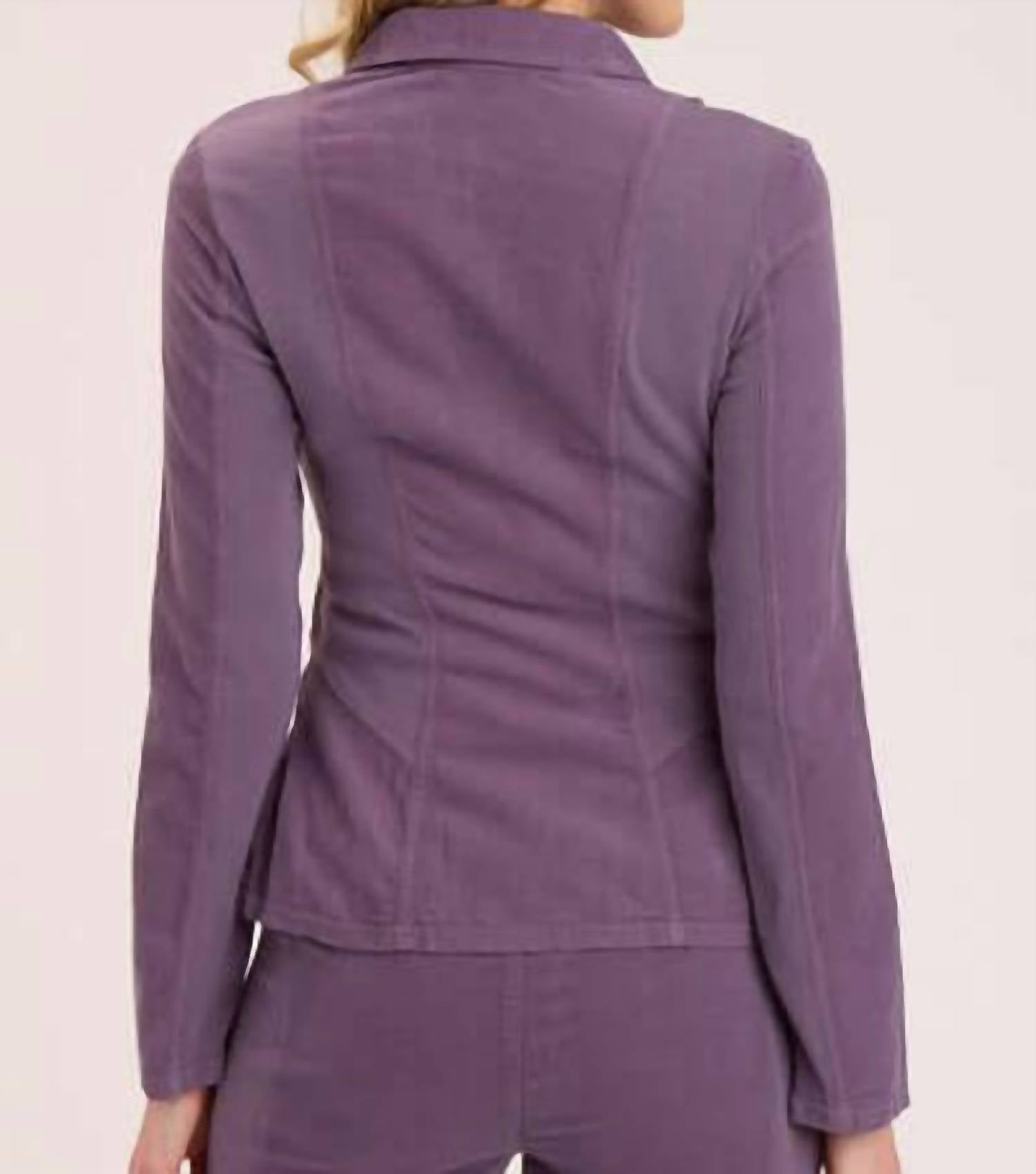 A blazer so versatile you can wear it to the office or pair it with jeans for a more casual look. Introducing the Cord Raphael Blazer by XCVI, a bold statement piece in rich purple crafted from 100% cotton corduroy. This women's blazer boasts long sleeves and a distinctive collar neckline, enhanced by fabric-mixed contrasting panels, eyelets along the pocket edges, and brass ring snaps. It features a convenient zip closure. Care for it easily with machine wash instructions.