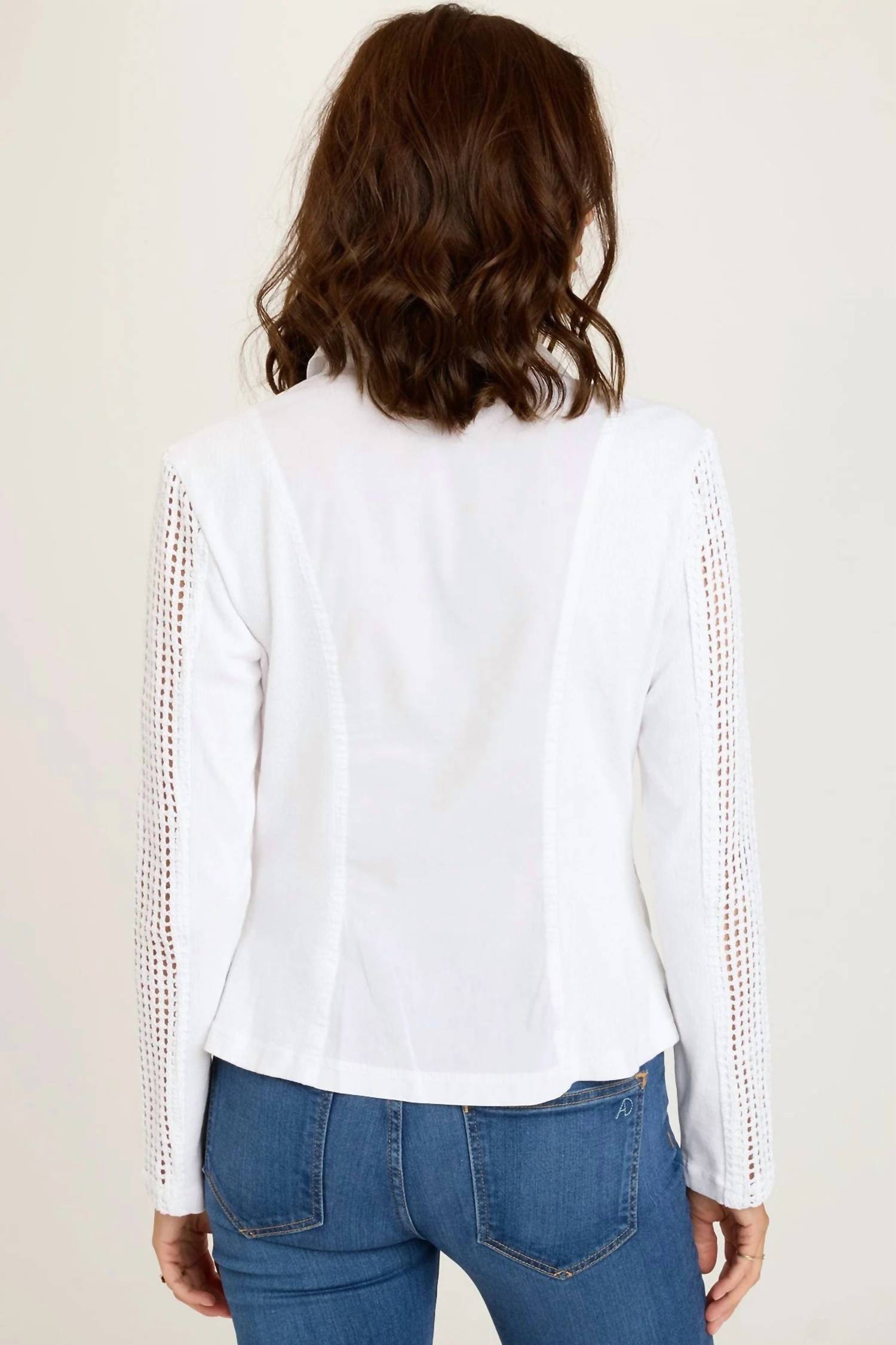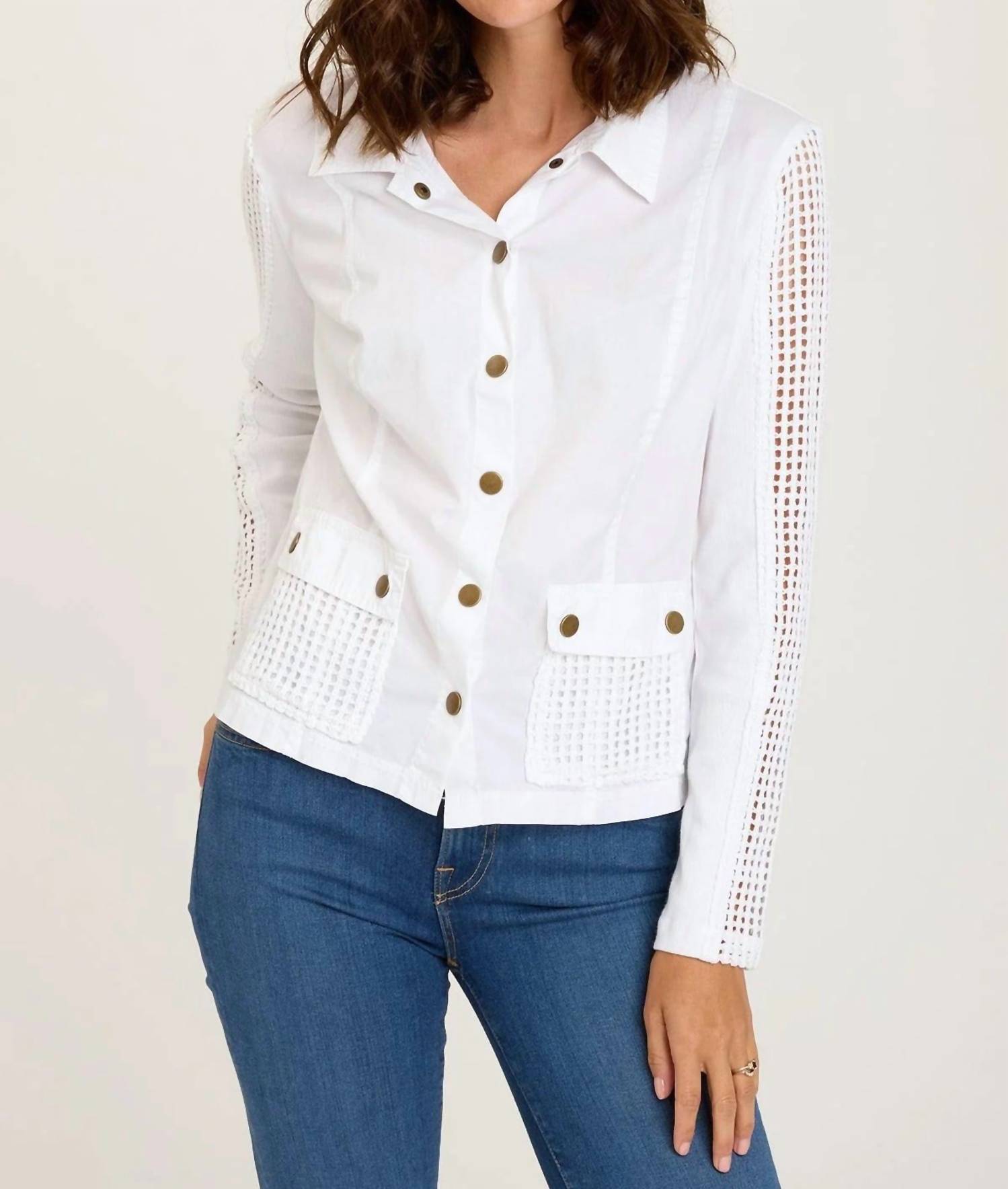 A jacket so versatile you can literally wear it with anything.Embrace effortless style. Perfect blend of casual chic and functional design. Snap-closure shirt-jacket. Crisp bright white hue. Mesh front bottom pockets and detailed panels running down the sleeves. Classic collar. Slightly shorter silhouette. Playful, modern edge. Made from a premium blend of Brio Poplin and Cotton Crochet. Preshrunk and machine washable qualities.