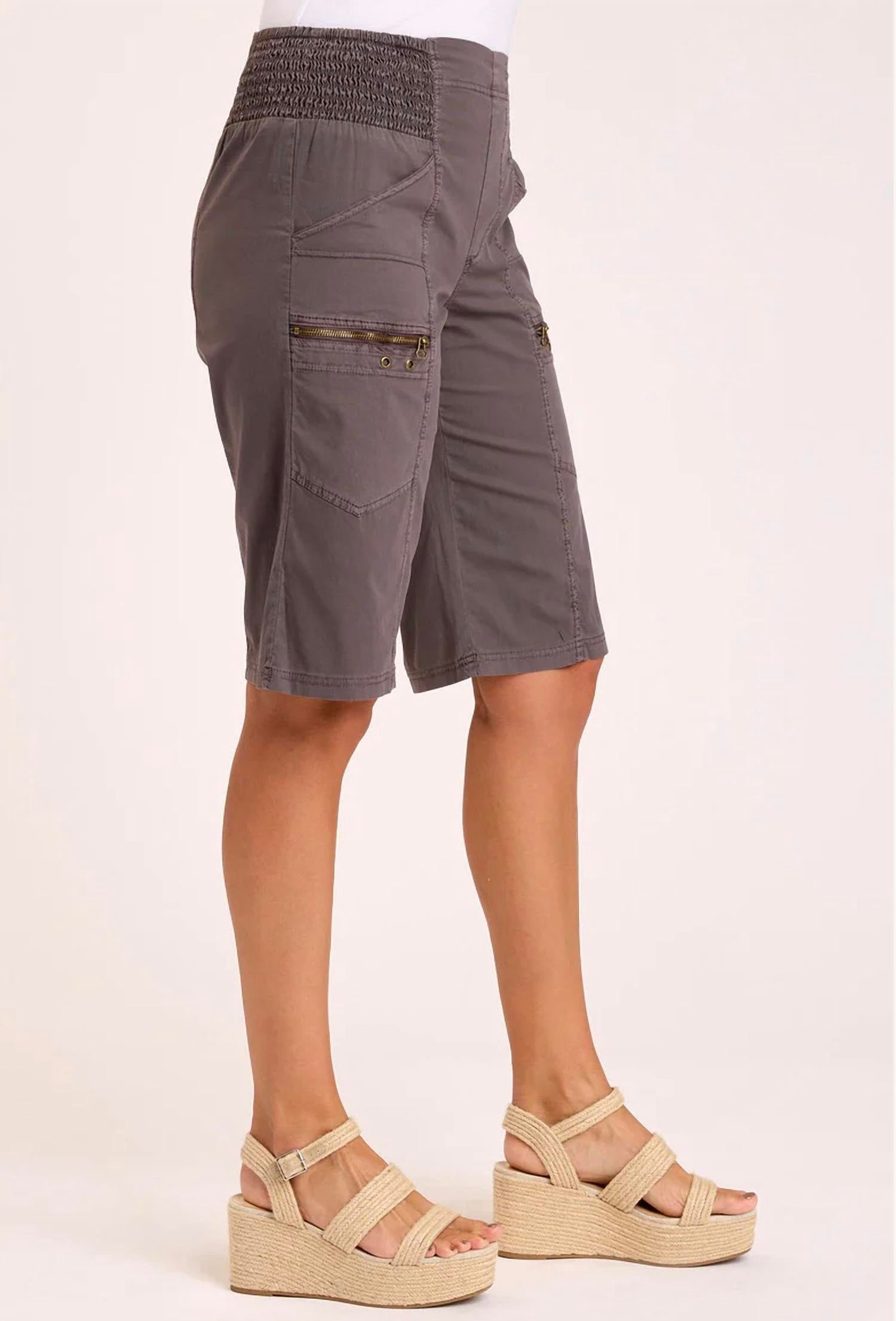 A preppy and feminine take on the classic bermuda short. Comfortable enough to lounge in and cute enough to wear out during your next warm weather outing. A wide leg bermuda with smocked panels at waist, slit pockets with exposed zipper and grommet details and style lines for added structure.