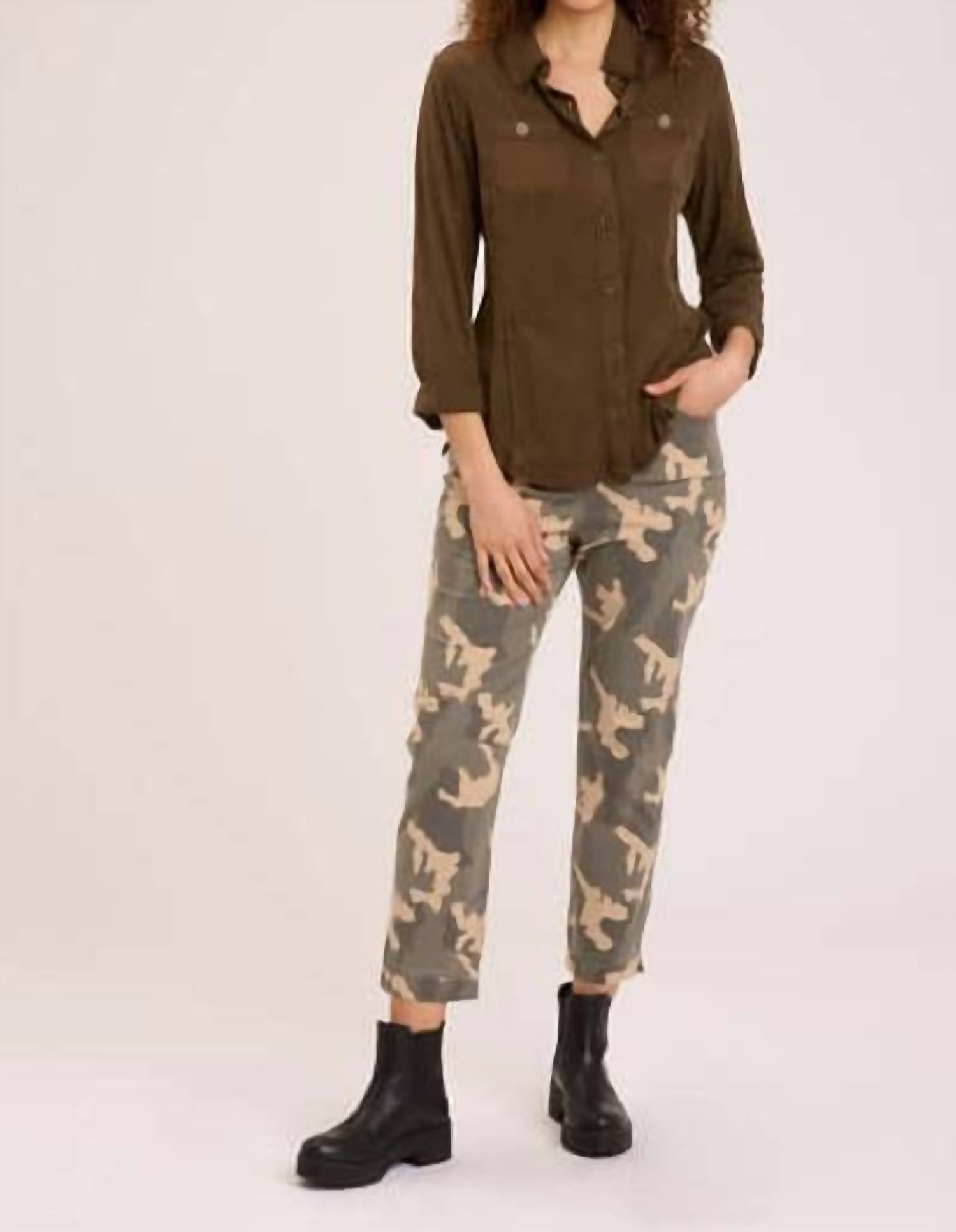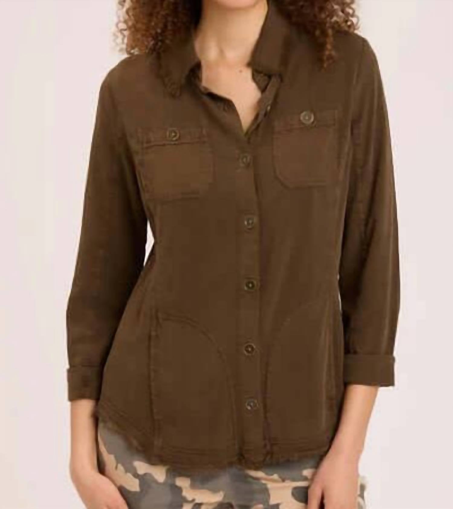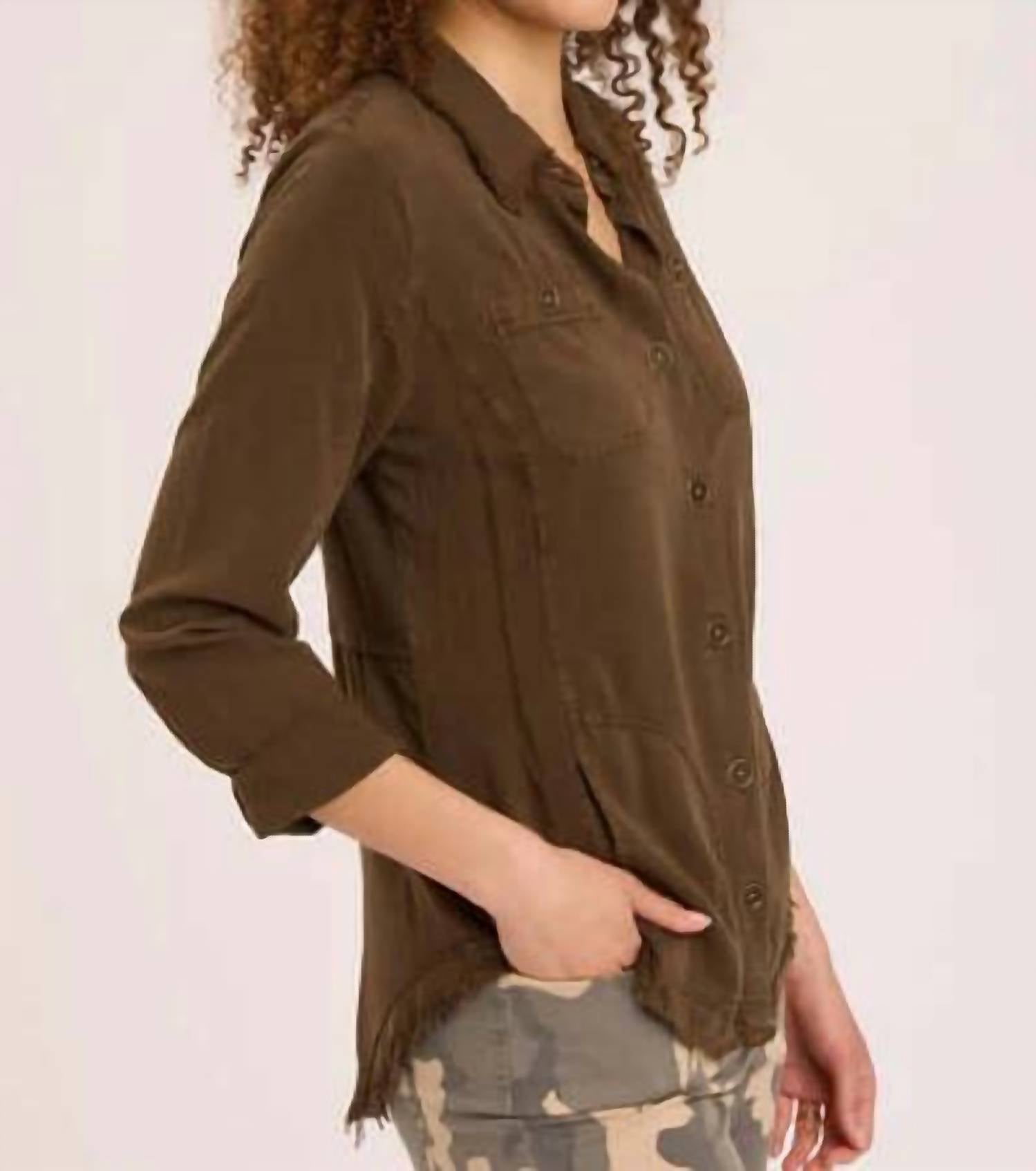Great fit, cute design, soft fabric. You'll love everything about this long sleeve tee. Introducing the Jareth Shacket by XCVI, a stylish long sleeve piece in a deep boxwood pigment. Crafted with 70% taissa twill and 30% rayon, this shacket features a button closure and both waist and chest pockets for functionality and style. The raw edge collar and hem details add a unique touch, while its preshrunk fabric ensures a perfect fit. Care for this piece with ease as it is machine washable.
