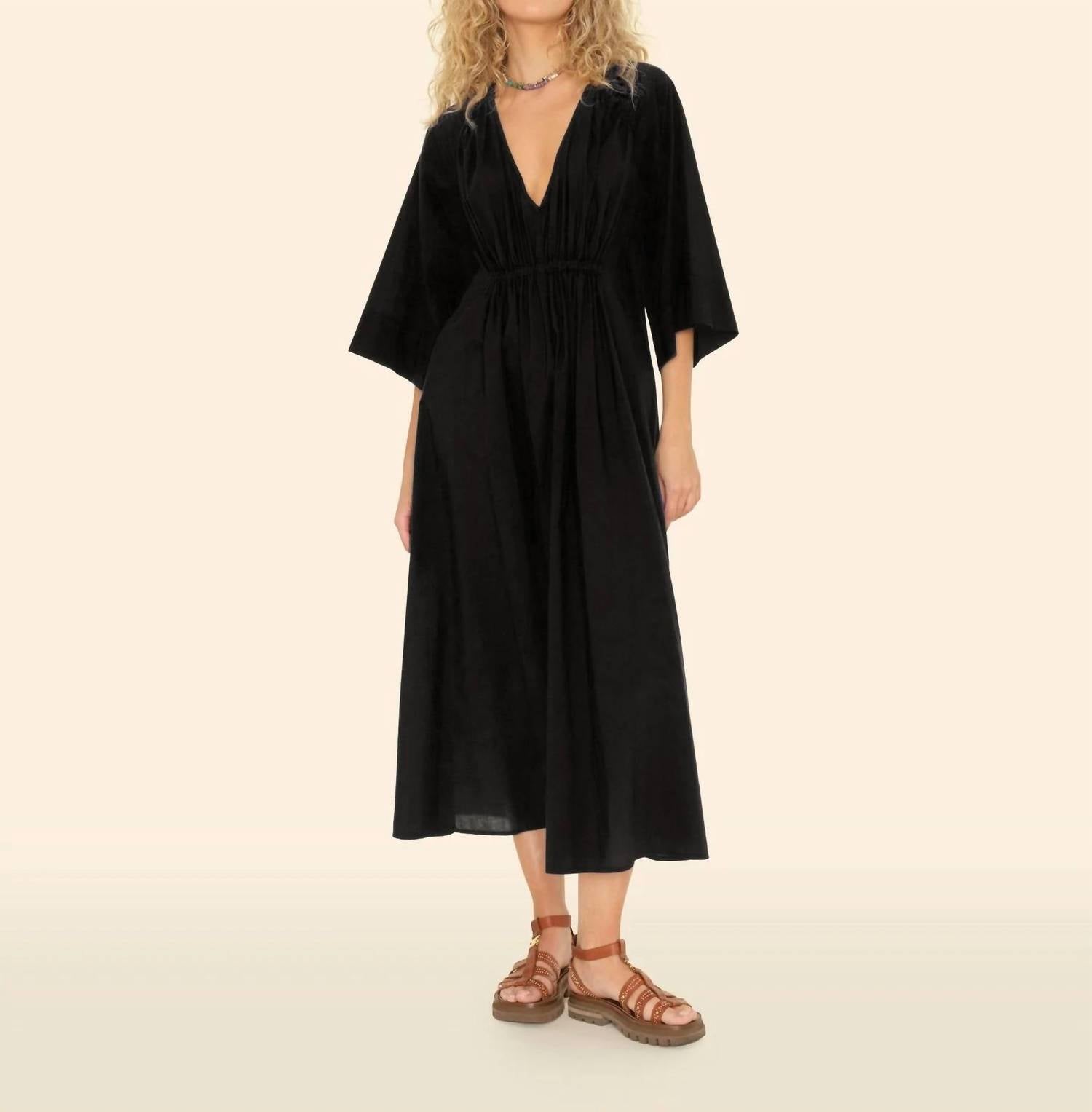 Just add slides or mules and you are good to go. Discover the Angela Dress by XIRENA, a stylish addition to your wardrobe with its elegant black hue and A-line silhouette. Featuring three-quarter bell sleeves and a deep V-neck, this midi dress is crafted in the USA from 100% cotton for a comfortable, lightweight feel. The design includes a soft elastic at the waist for a flattering fit and a convenient pull-on closure. Perfect for any occasion, this dress effortlessly combines comfort and style.