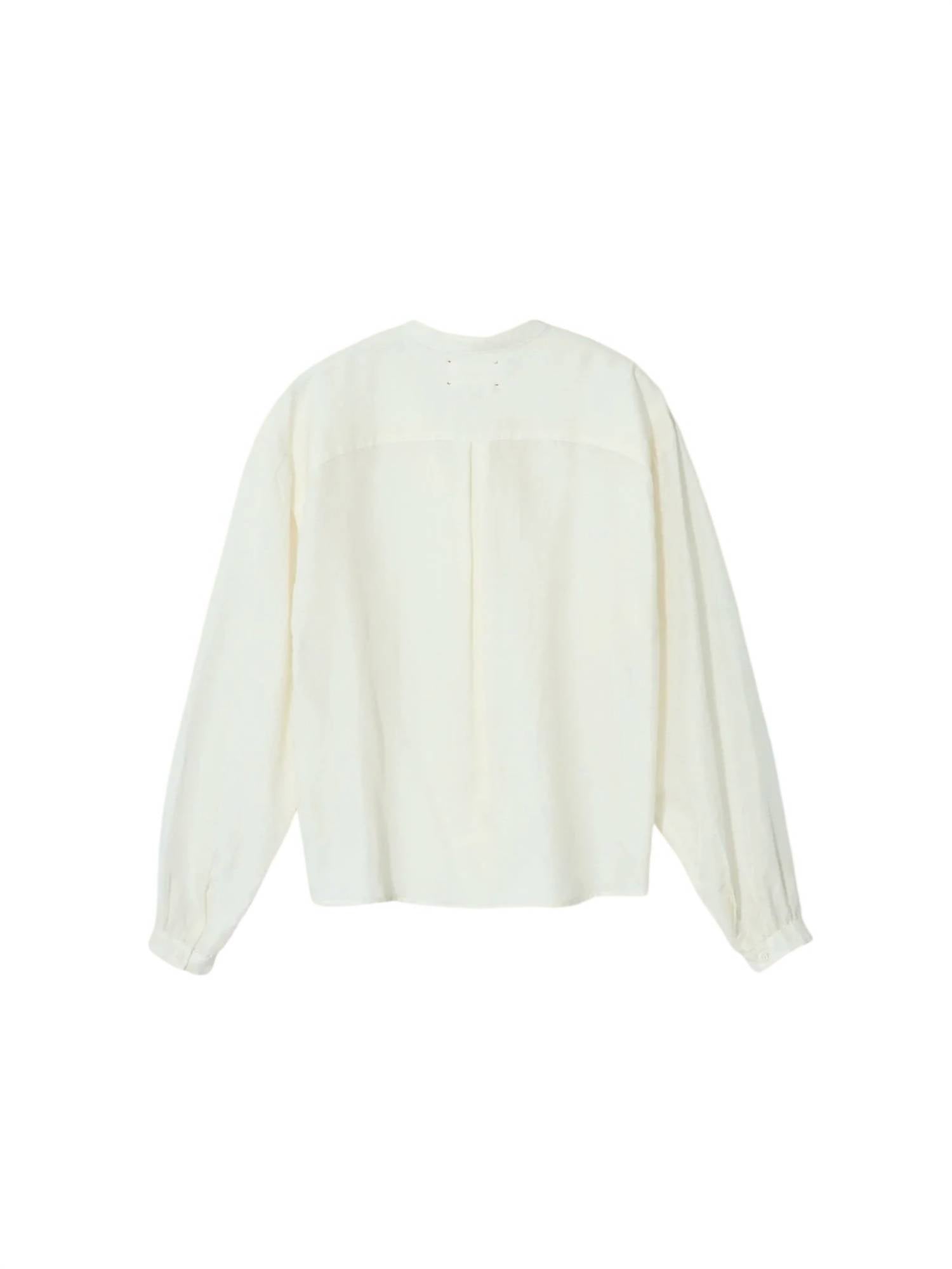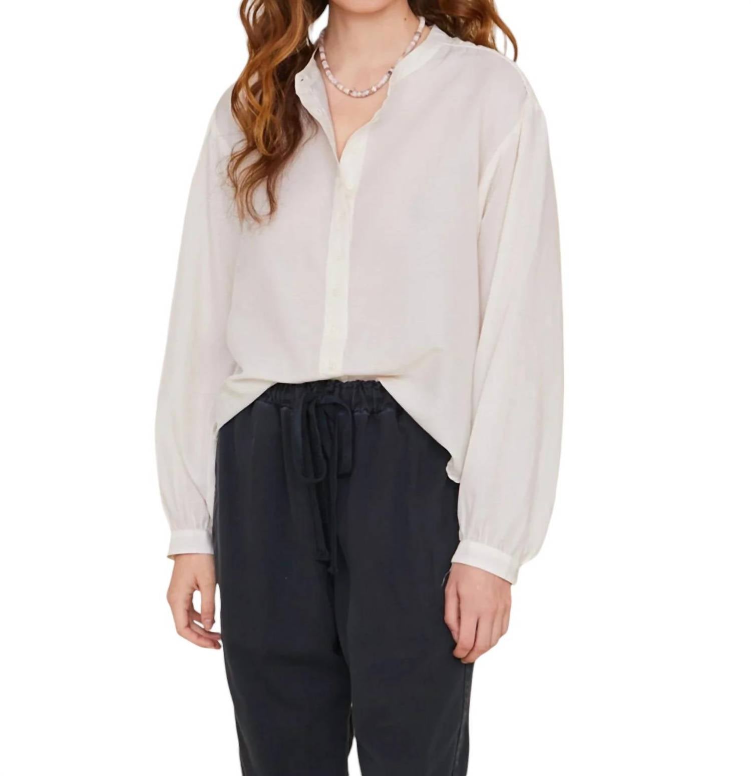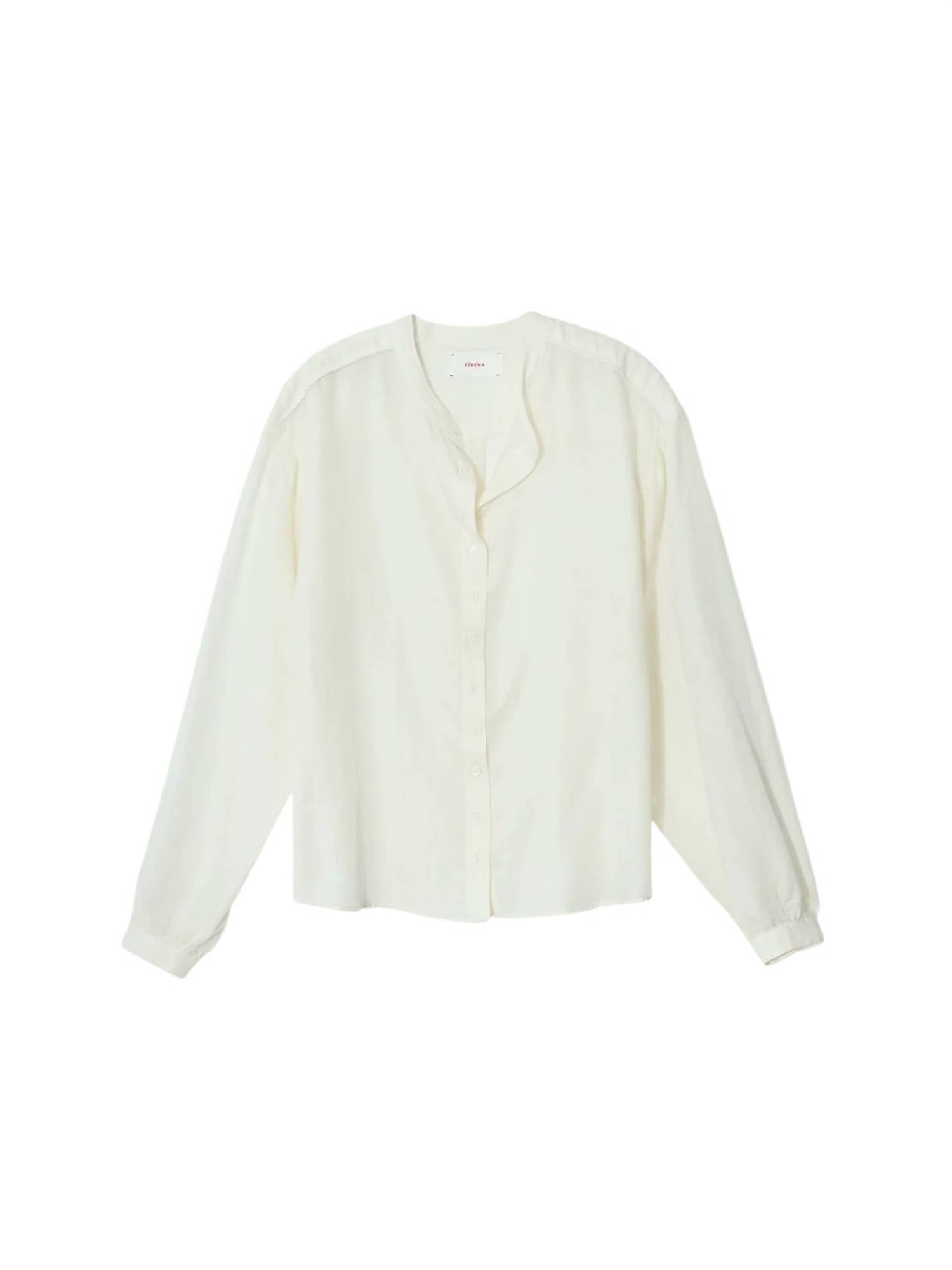 This button down shirt is comfortable yet polished.This button-front shirt features a band collar, shirred blouson sleeves, and piping at the shoulder for a refined look. Crafted from a medium-weight fabric, it combines 70% cotton and 30% silk for a soft, breathable feel. True to size, the shirt is easy to care for with a hand wash cold. The model is 5'8" and wears a size small. Made in the USA.