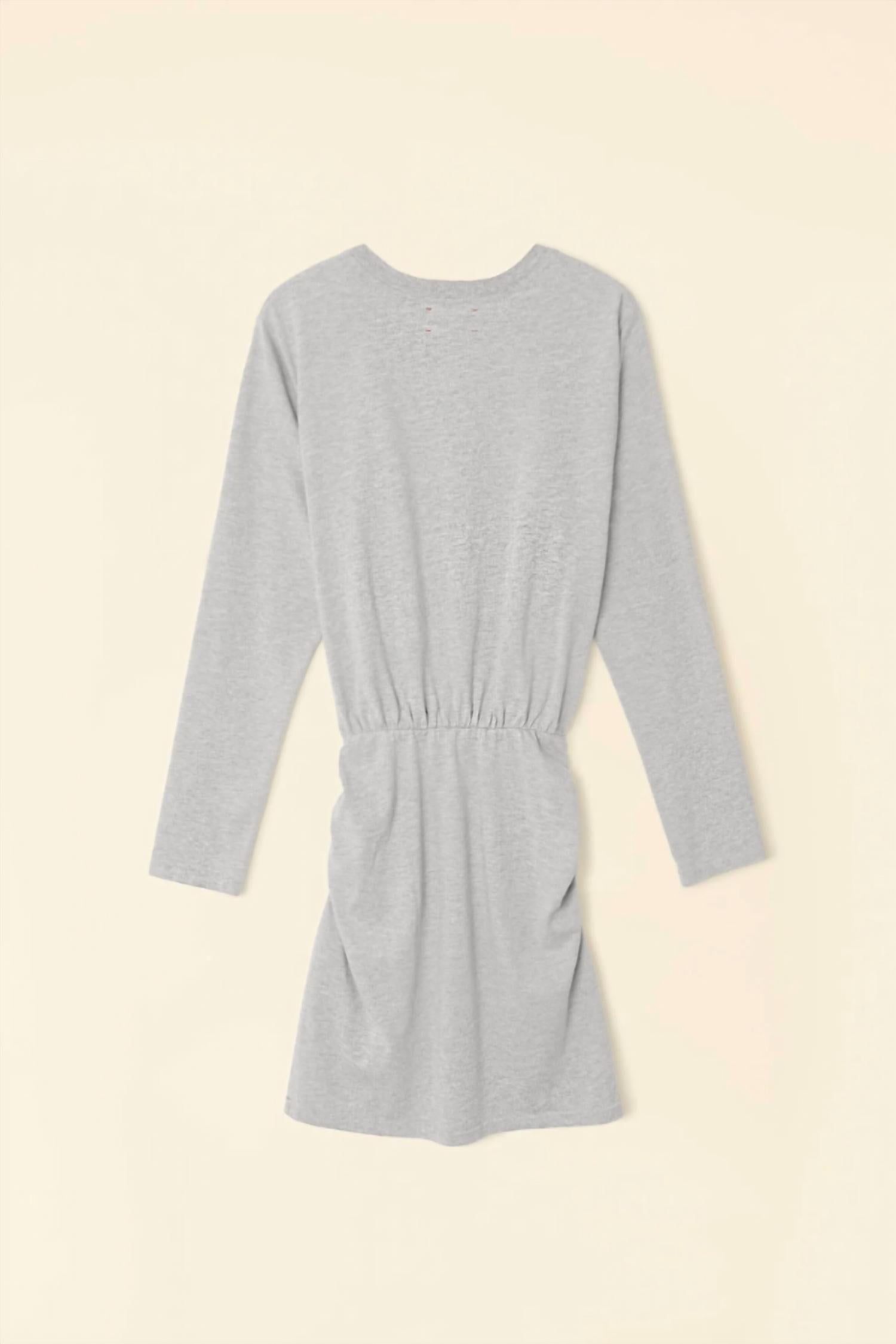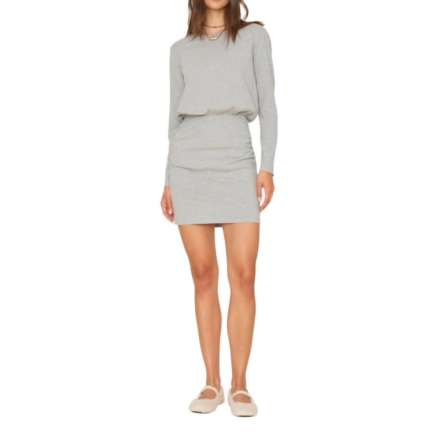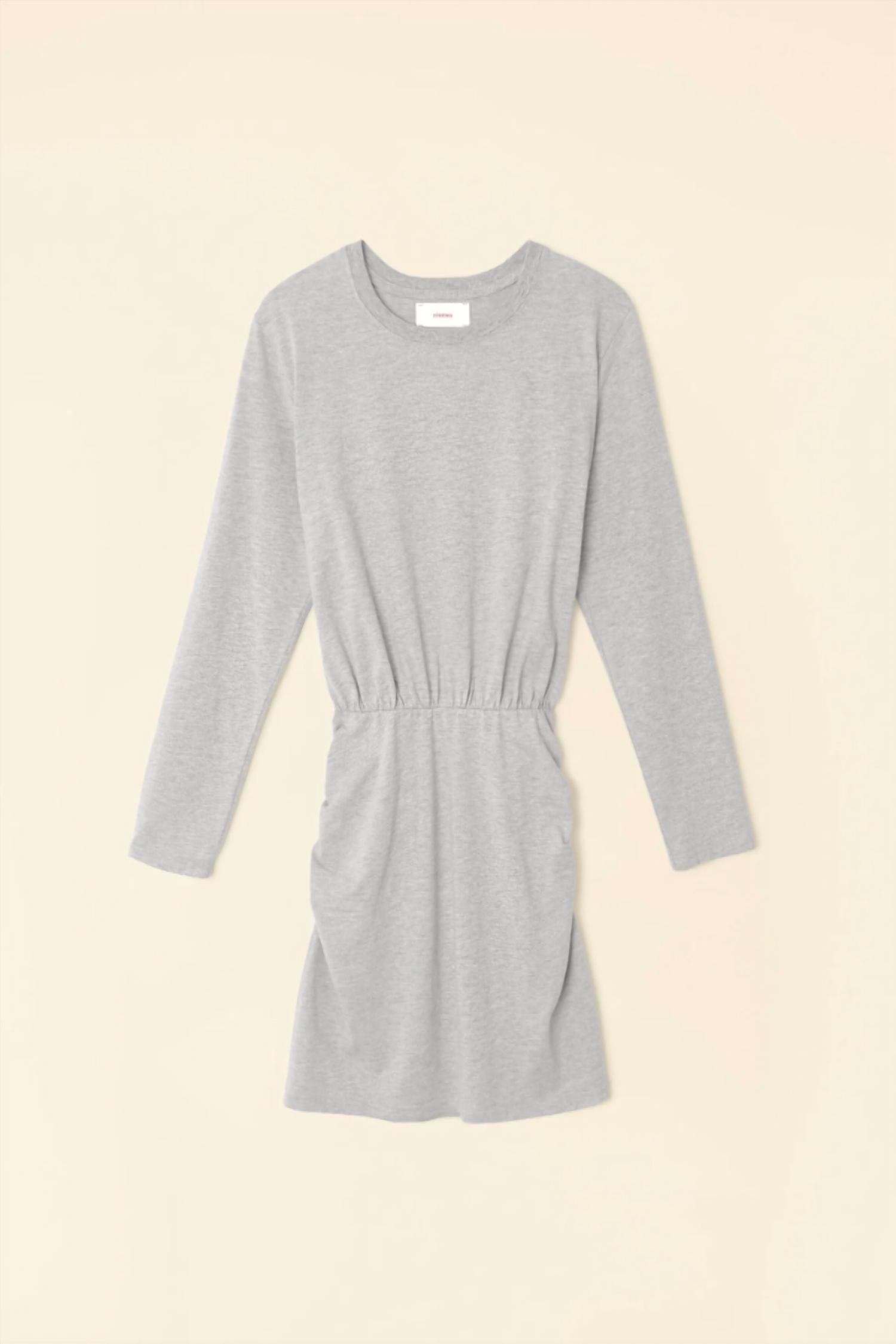 A short and breezy dress for those warmer days. The Lula Dress by XIRENA offers timeless charm in a casual, heather grey hue. This women's long sleeve mini dress with a crewneck is crafted from Oaklen Jersey, composed of 90% Cotton and 10% Polyester, providing a cozy and soft feel. Made in Los Angeles, it features a pull-on style with an elastic ruched waist for a flattering A-line silhouette. Easy to care for, simply machine wash on a gentle cycle and tumble dry on low. The model is 5'10" and wears a size small.