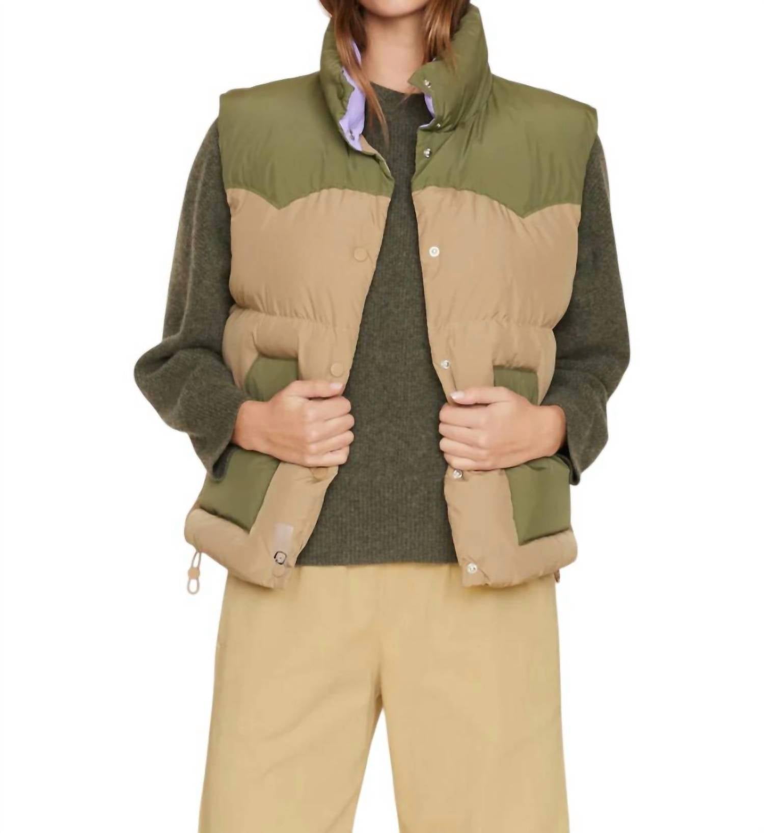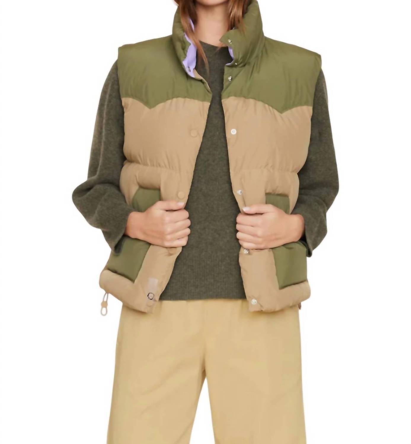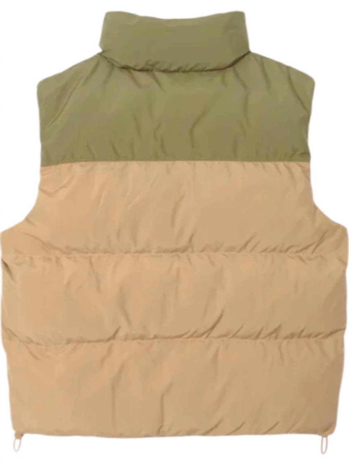 A vest so versatile you can mix and match it with almost any outfit and it will feel brand new every time. Quilted puffer sleeveless, color-blocked piece. Comes lined for extra warmth. Features a turtleneck design with a Western-inspired front yoke. Crafted from 100% polyester. Includes practical elements like a snap button-front closure and slanted front pockets. Internal drawcord at the hem offers adjustable fit options. Machine wash cold, gentle cycle, and tumble dry low.