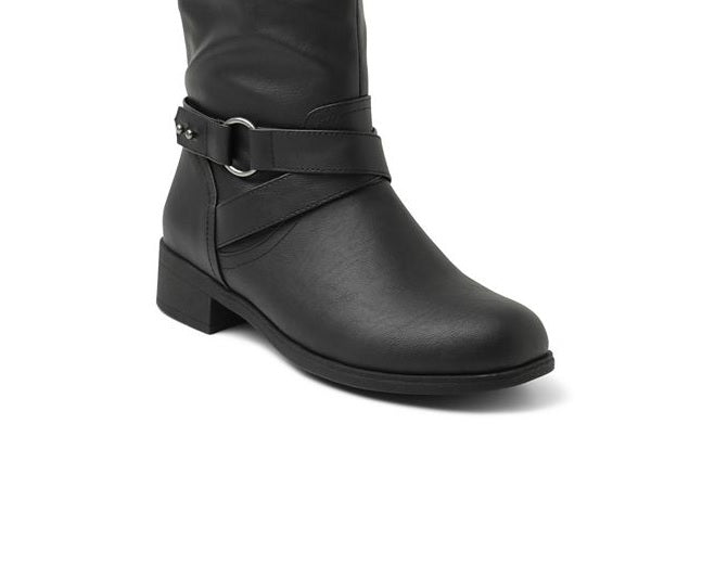 A double strap around ankle. Wide Calf width| Half inner zipper closure| Double buckle ankle strap