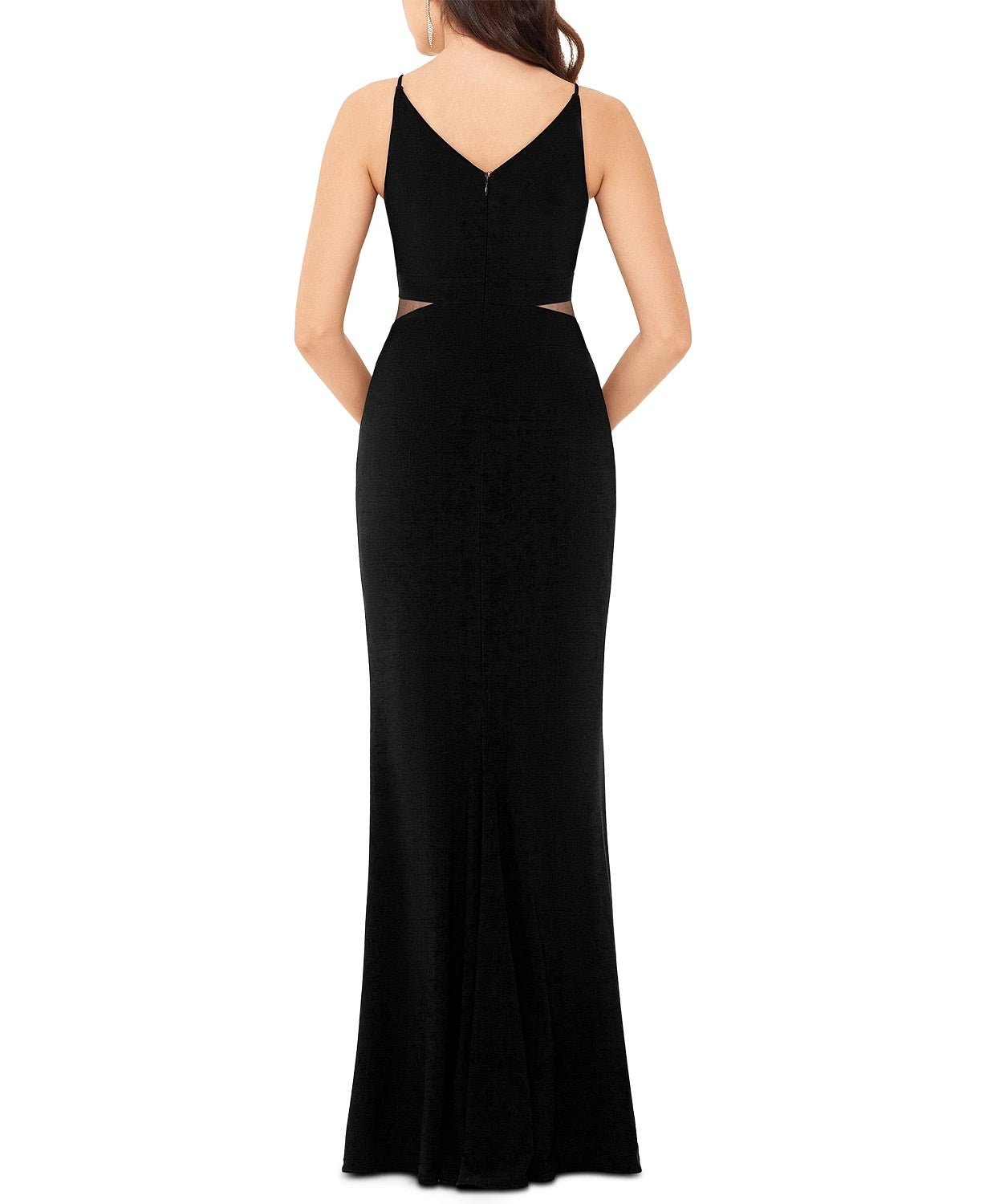 Approx. 61" long from center back neck to hem. Length is based on size 6 and varies 1/8" between sizes|V-neck; Gown silhouette|Back zipper closure|Mesh cutout detailing on sides|IMPORTANT NOTE: This item arrives with a return tag attached and instructions for removal. Once the tag is removed from the dress, this item cannot be returned.|Polyester/spandex; lining: polyester
