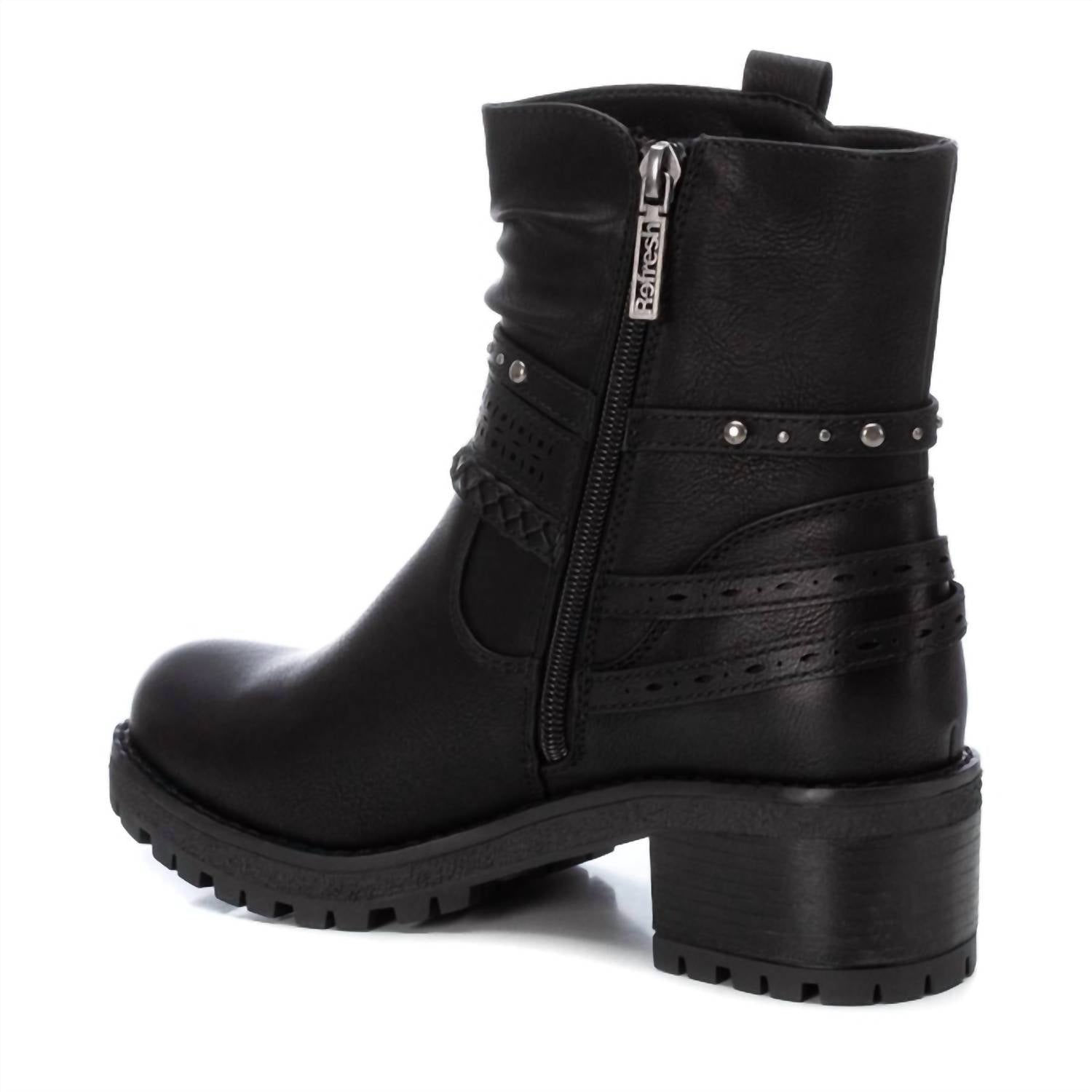Say hello to the perfect, most versatile boot. The ankle height makes this style easily transition from day to night. Wear them with your favorite skinny jeans and tee for a more laid back look, or pair them with your favorite mini dress and jacket for a night out on the town.This Ankle Bootie features faux leather with decorative straps and metallic accents. The side zipper, low block heel, and serrated non-slip sole provide comfort and stability, making it a stylish, vegan-friendly option for any outfit.