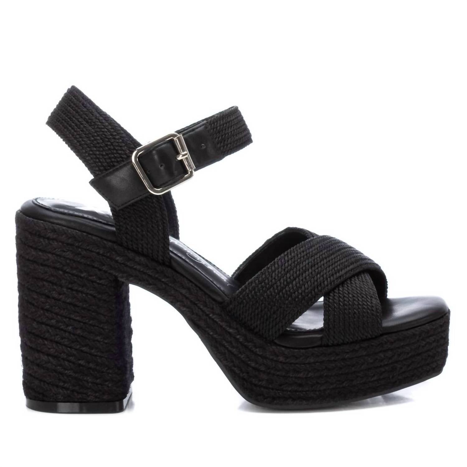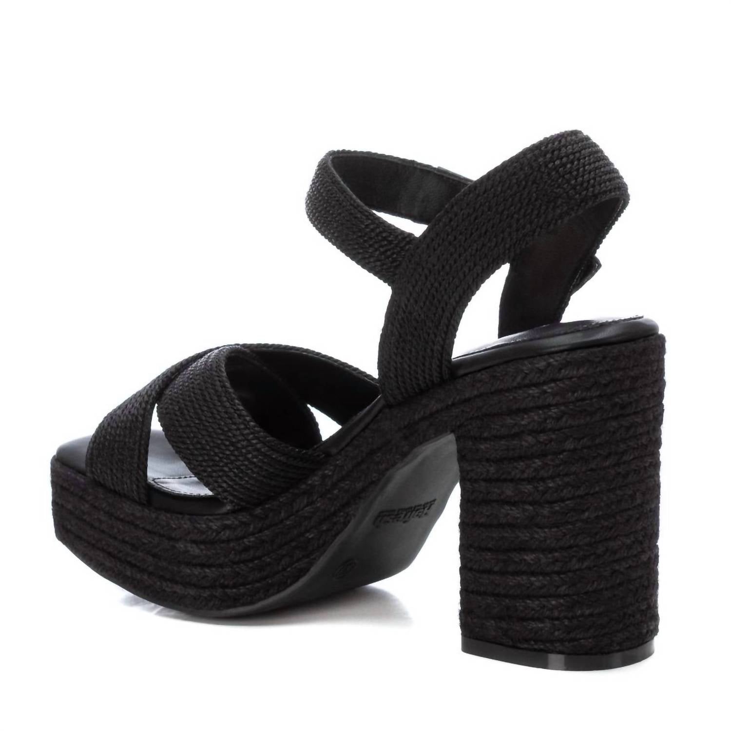 This sandal will take you from brunch to dinner and everything in between. Elevate your style with the Xti Women's Heeled Jute Sandals in captivating black. Crafted from metallic textile material, these stylish sandals feature a metallic buckle closure and offer a 3.75-inch block heel lined in metallic jute. The design includes a squared toe shape, non-slip rubber sole, and a comfortable padded insole, making them ideal for both beach days and dining out.
