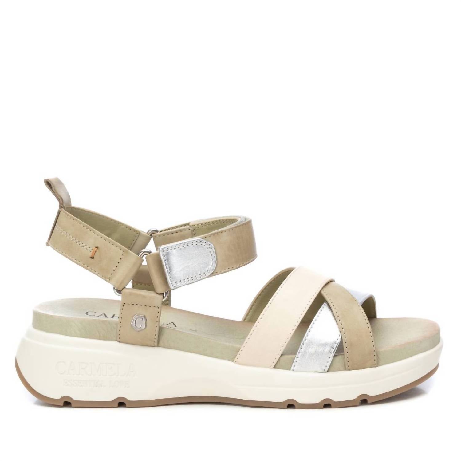Flowy dresses, cropped pants, and even jumpsuits... this sandal works with them all! Elevate your summer wardrobe with the Women's Leather Sandals by Xti in khaki, a perfect blend of style and comfort. Featuring a wedge heel and round toe, these sandals are crafted from high-quality leather for durability and a luxurious feel. The metallic finish intertwined straps add a touch of sophistication, complemented by a convenient Velcro fastening and rear puller. Designed for the modern woman, these sandals from the Carmela Collection ensure you step out in style this season.