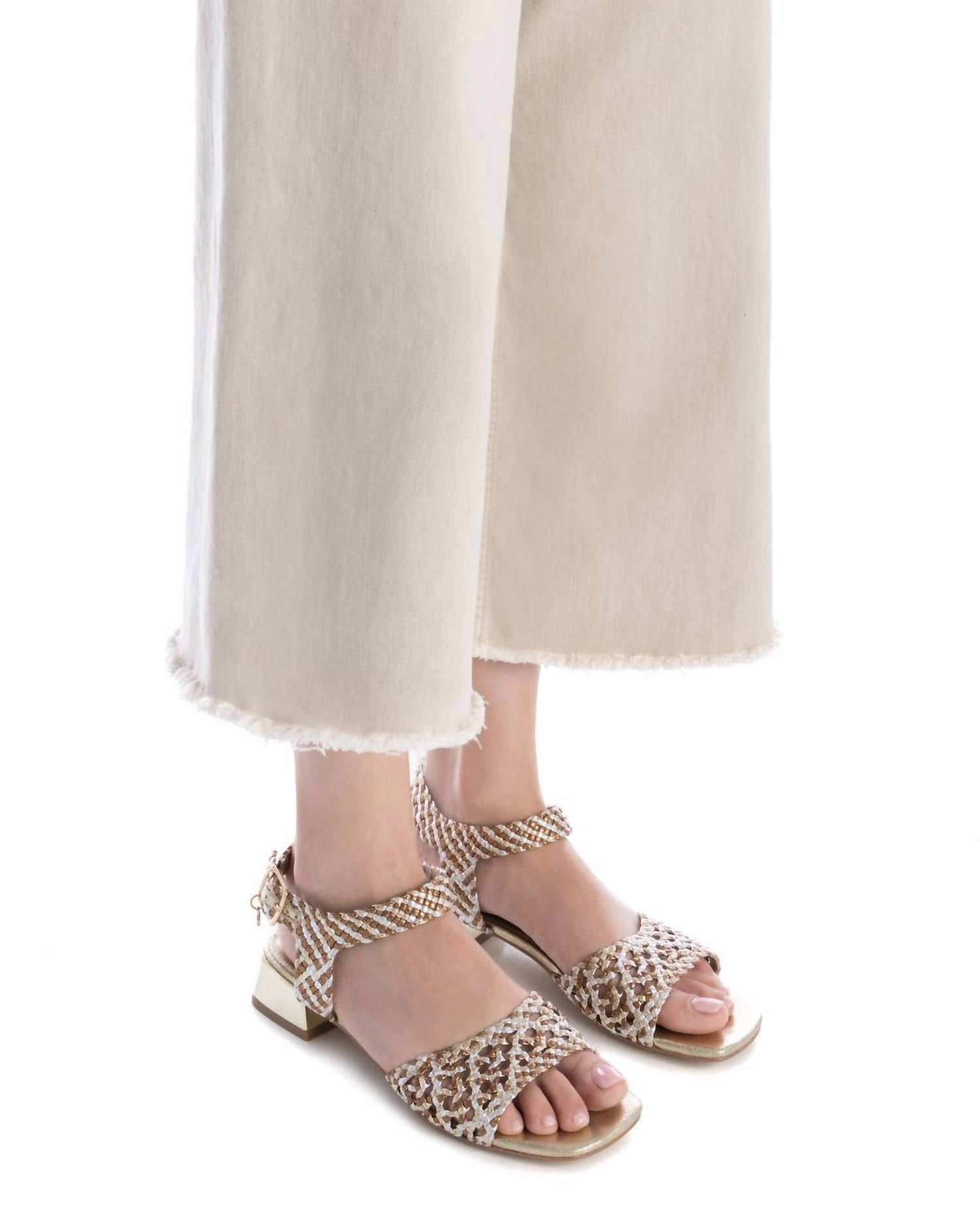Flowy dresses, cropped pants, and even jumpsuits... this sandal works with them all! Step into effortless style with the Women's Low Heel Sandals by Xti, featuring a chic squared toe design in a radiant gold hue. Crafted from high-quality nylon, these sandals include a lightweight anti-slip outsole for enhanced stability and a Comfortech insole for all-day wearability. Its casual design is complemented by a practical approximately 1.0 inch block heel, perfect for any occasion. Let these sandals elevate your wardrobe with their blend of fashion and comfort.