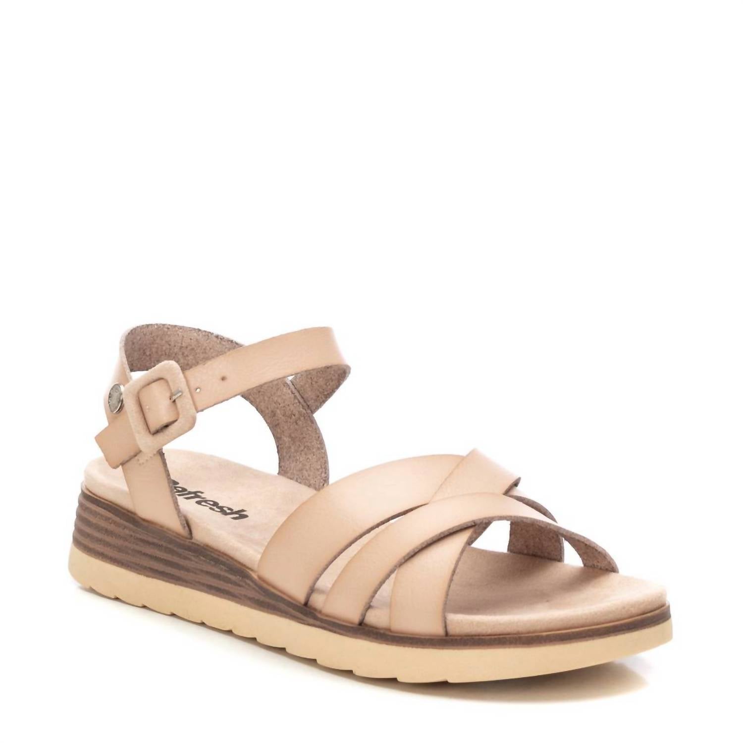 This sandal will take you from brunch to dinner and everything in between. Step out in style with the Women's Low Wedge Sandals by Xti, a perfect blend of fashion and comfort. Crafted from high-quality faux leather, these beige sandals feature a chic wedge heel design with a round toe shape, making them ideal for both beach outings and dining experiences. Designed with a Comfortech insole and lightweight anti-slip outsole, these sandals promise all-day comfort and stability. Elevate your wardrobe with these versatile sandals, suitable for any occasion.