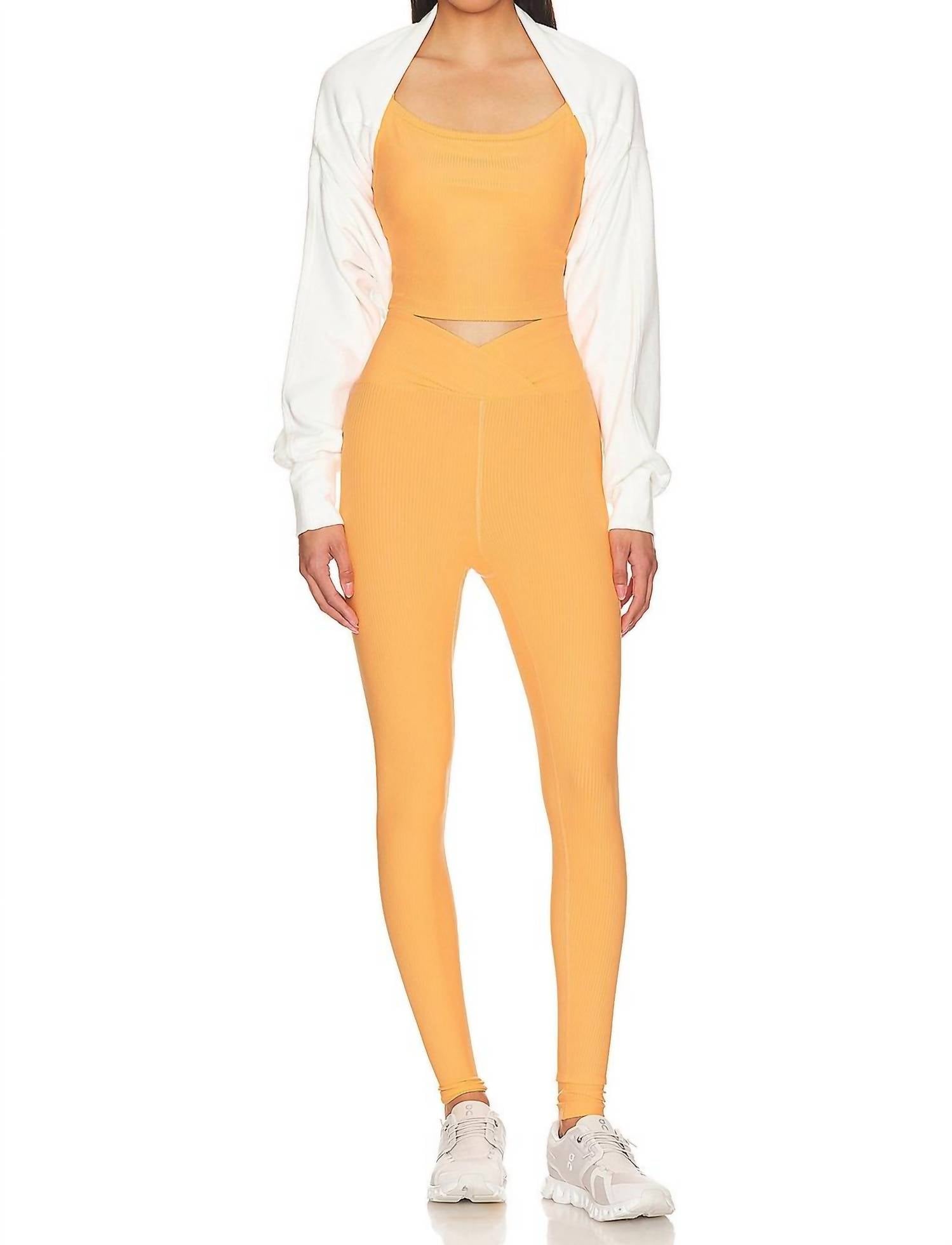 Leggings you can dress up or down for any occasion. Experience the perfect blend of style and comfort with the Ribbed Veronica Legging by YEAR OF OURS, crafted in a stunning Apricot Crush. These high-rise leggings feature a skinny leg style and a pull-on closure, ensuring a sleek and seamless look. With a composition of 85% nylon and 15% spandex, these leggings offer just the right amount of stretch. Made in the USA, they boast a fashionable surplice front and ribbed fabric, suitable for everyday wear. Care instructions: machine wash cold and lay flat to dry, with an inseam of 26.5 inches.