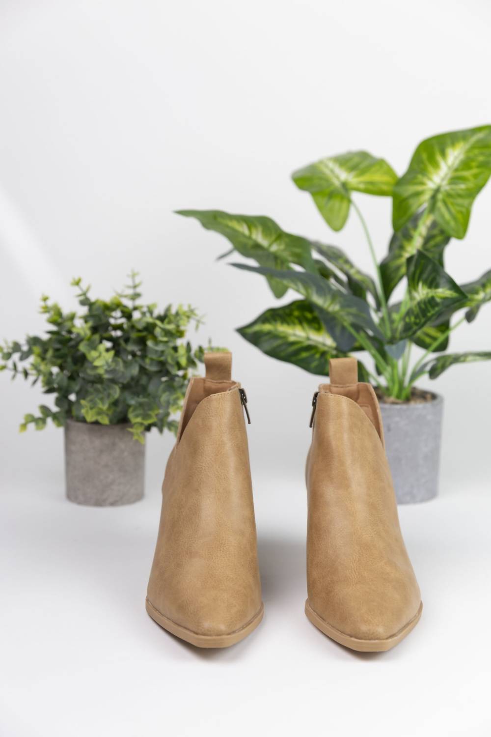 Say hello to the perfect, most versatile boot. The ankle height makes this style easily transition from day to night. Wear them with your favorite skinny jeans and tee for a more laid back look, or pair them with your favorite mini dress and jacket for a night out on the town. Step out in style with the Women's Capriana Bootie by YELLOWBOX, where rustic charm meets classic design. This bootie features a faux leather upper with a distinctive pointed square toe, an inside ankle zipper for easy wear, and a practical pull tab at the back. Highlighting a sleek V cutout on the ankle, it boasts a mid-height 2.5" block heel perfect for any occasion. All man-made materials ensure durability and comfort, offering a true-to-size fit in a stylish sand color.