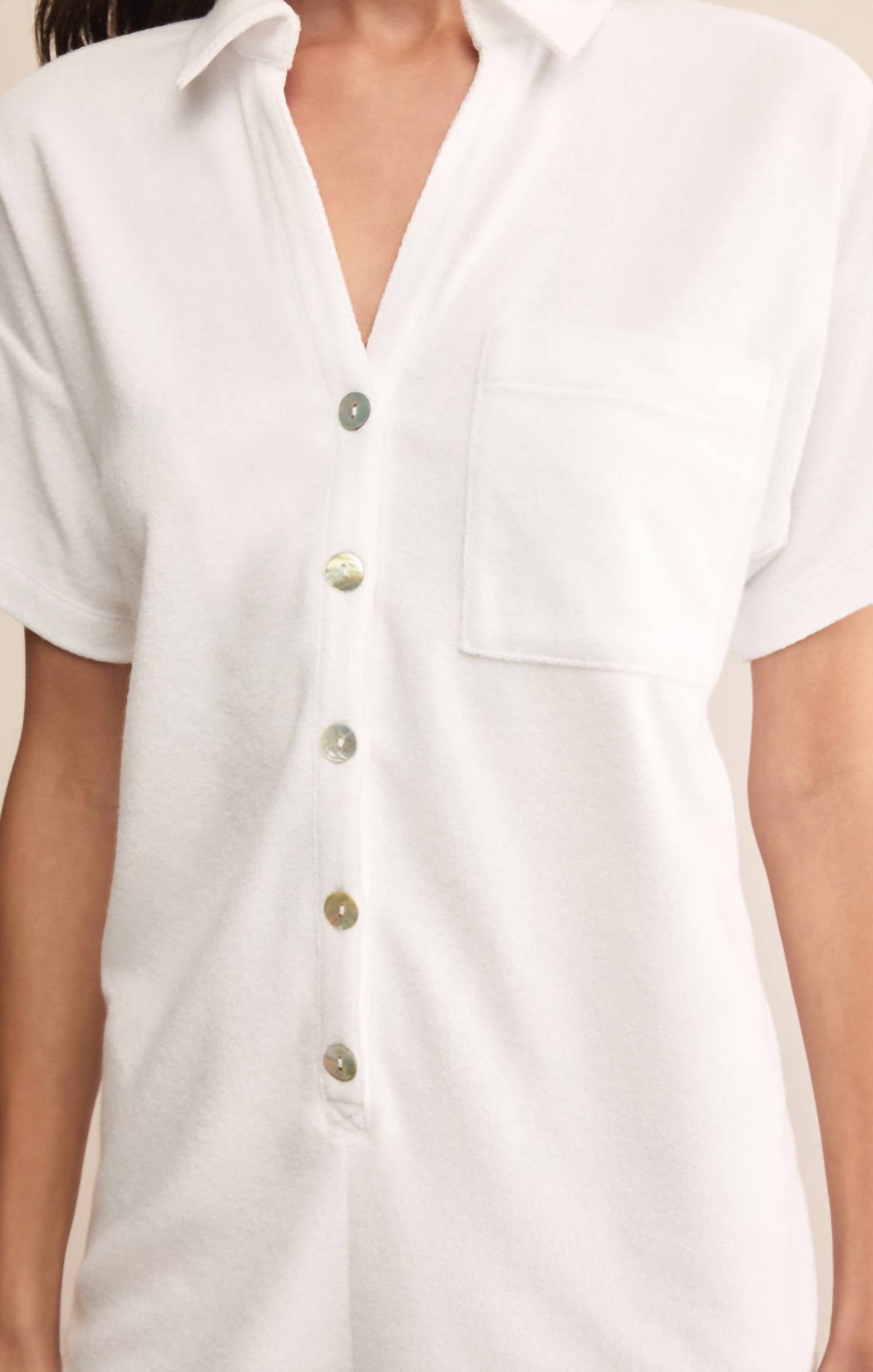 The perfect outfit choice when you you need something quick to throw on and still want to look efforlessly cool. Introducing the Azur Terry Romper by Z Supply, a perfect blend of comfort and style in classic white. This short sleeve romper is crafted from a cozy Loop Terry fabric comprising 76% Cotton and 24% Polyester, offering a relaxed fit with a straight leg design. The button closure and collared neckline provide a polished touch, complemented by a convenient chest pocket. Machine wash cold, use a gentle cycle, and tumble dry low for easy care. Model is 5'10" wearing size S.