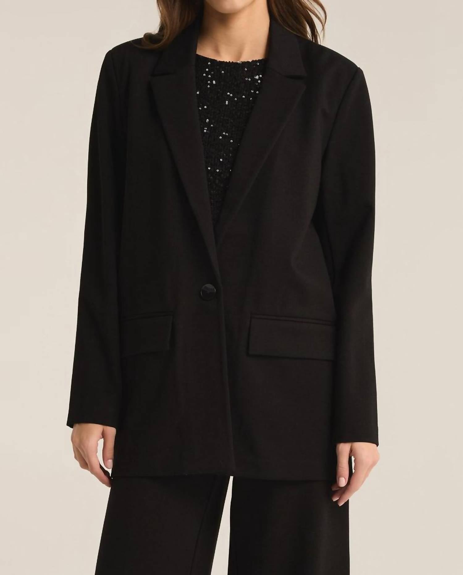 A blazer so versatile you can wear it to the office or pair it with jeans for a more casual look. Experience the effortless sophistication of the Z Supply "Do It All Relaxed Blazer" in classic black. Featuring long sleeves and a collared neckline, this heavyweight blazer is crafted from a mid-weight ponte blend of 62% Rayon, 33% Nylon, and 5% Spandex, offering a comfortable yet structured regular fit. The button front closure and convenient flap pocket add functional elements to its chic design. Perfect for a versatile and polished look, it effortlessly complements any wardrobe.