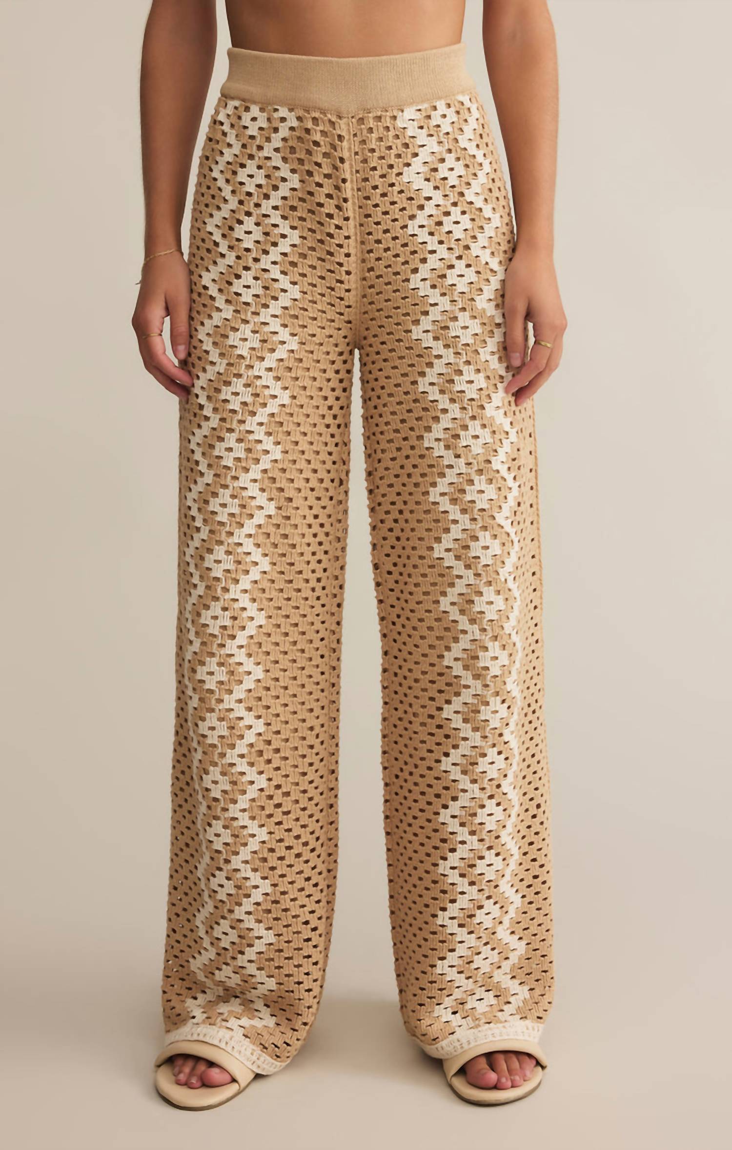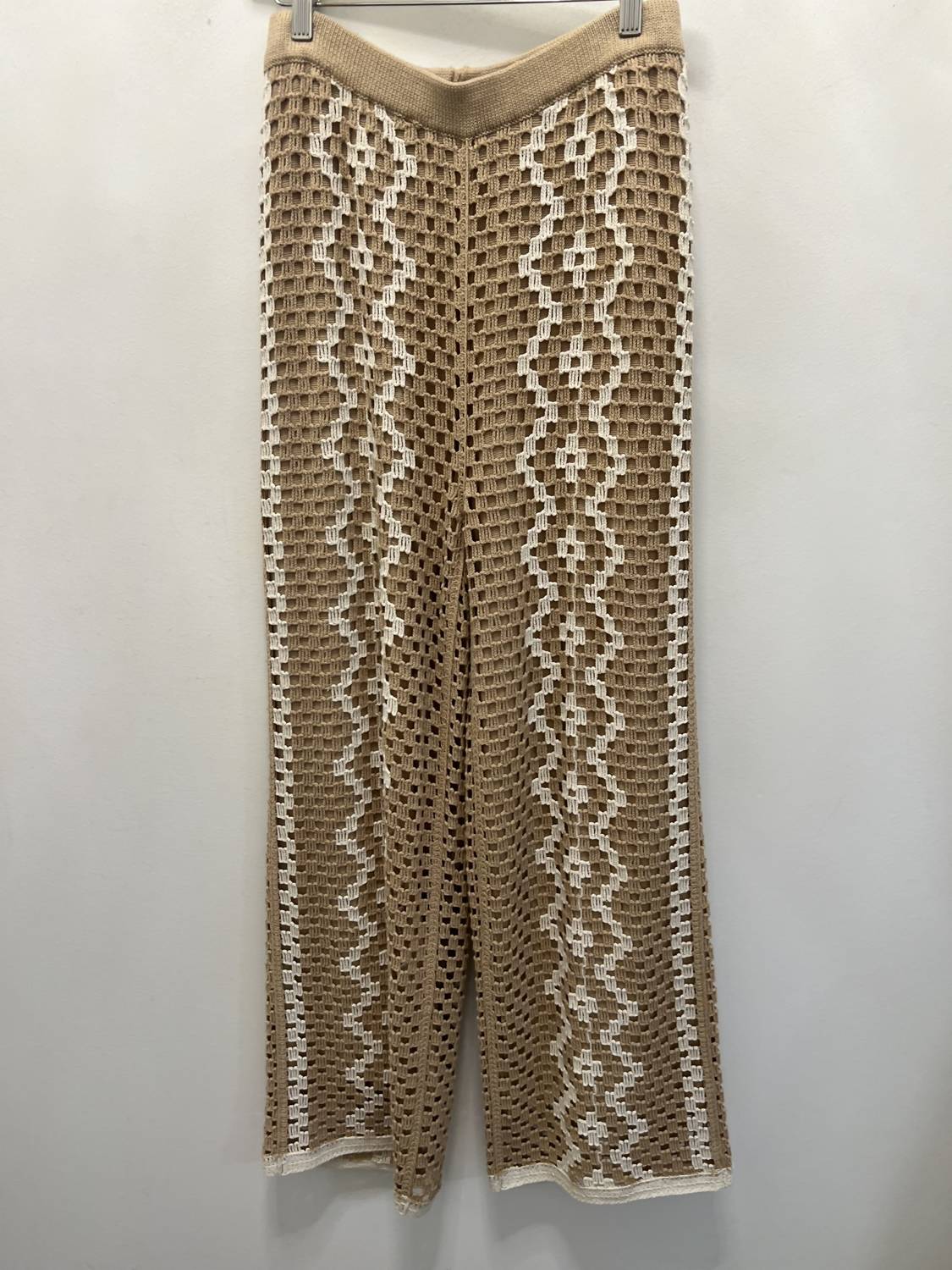 Embrace the boho spirit with the Loma Crochet Pant by Z Supply, showcasing a relaxed fit in a natural hue. Crafted from 100% cotton crochet knit, these mid-rise ankle-length pants feature a flared leg and a stylish textured pattern. With an elastic waistband and a pull-on closure, they offer ease and comfort. Care instructions recommend hand washing cold and reshaping to lay flat to dry. Model is 5′10″ and wearing a size S.
