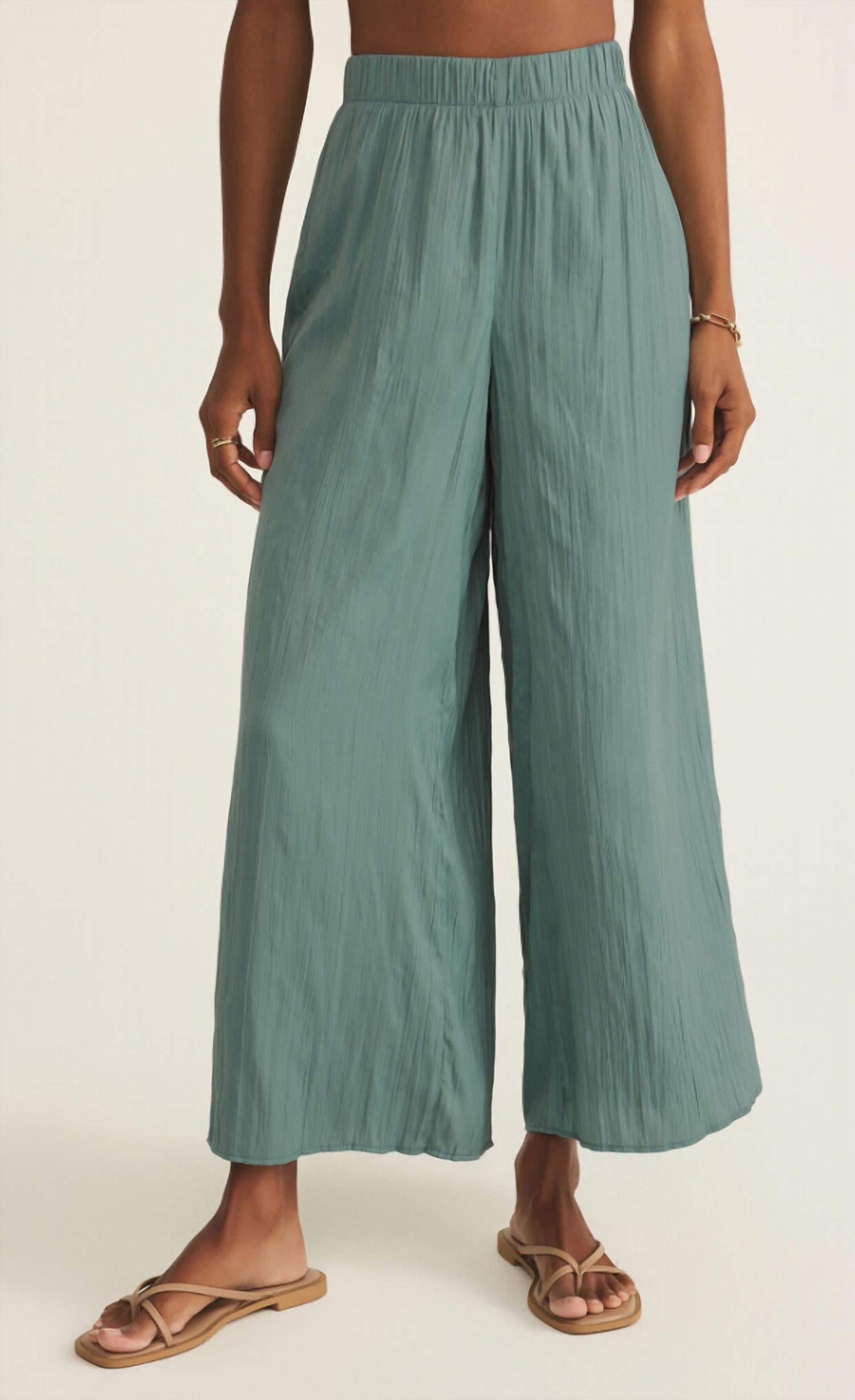 Embrace effortless elegance with the Sunset Satin Pant by Z Supply, crafted in a luxurious Sea Pine hue. These high-rise, wide-leg pants offer a regular fit and pull-on closure for seamless wear. Made from textured polyester, they provide a minimalist vibe perfect for summer vacations. Care: Dry clean only. Inseam: 27.5 inches, Rise: 12 inches.