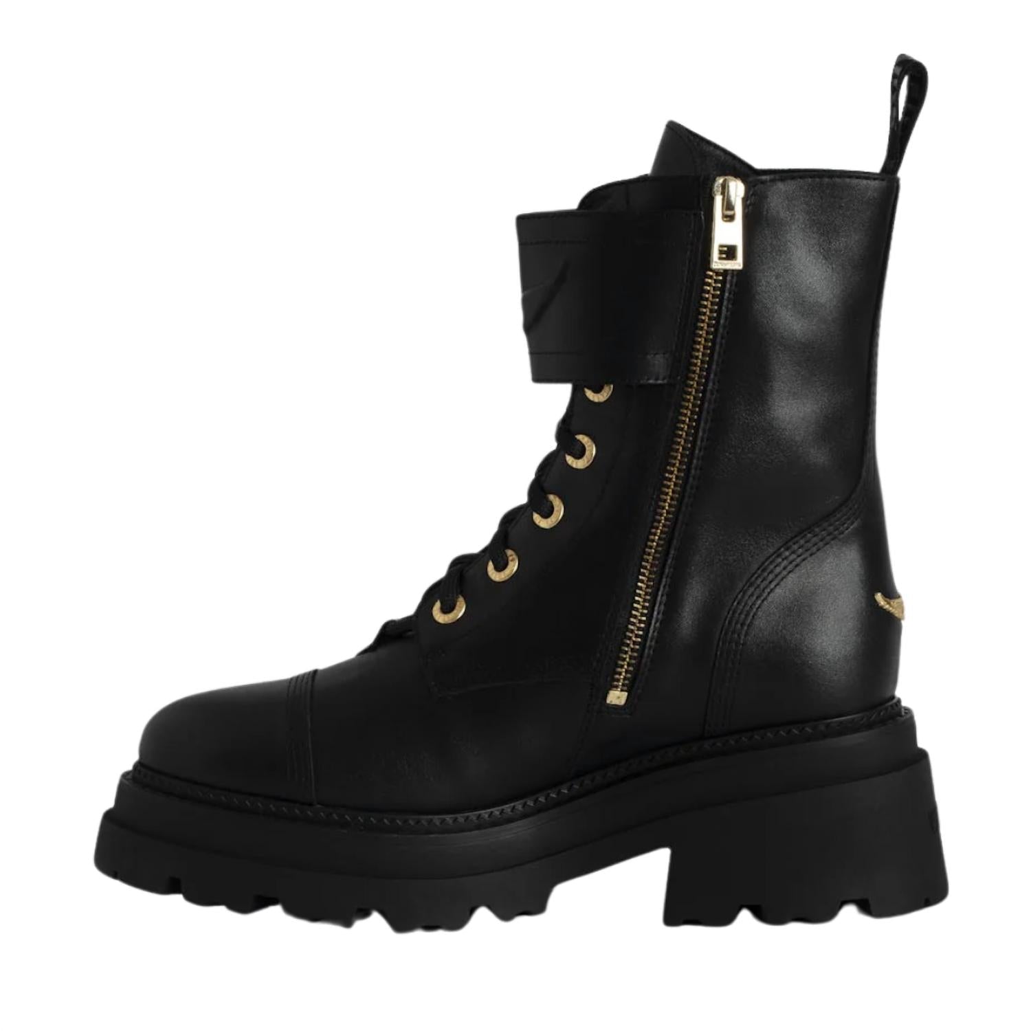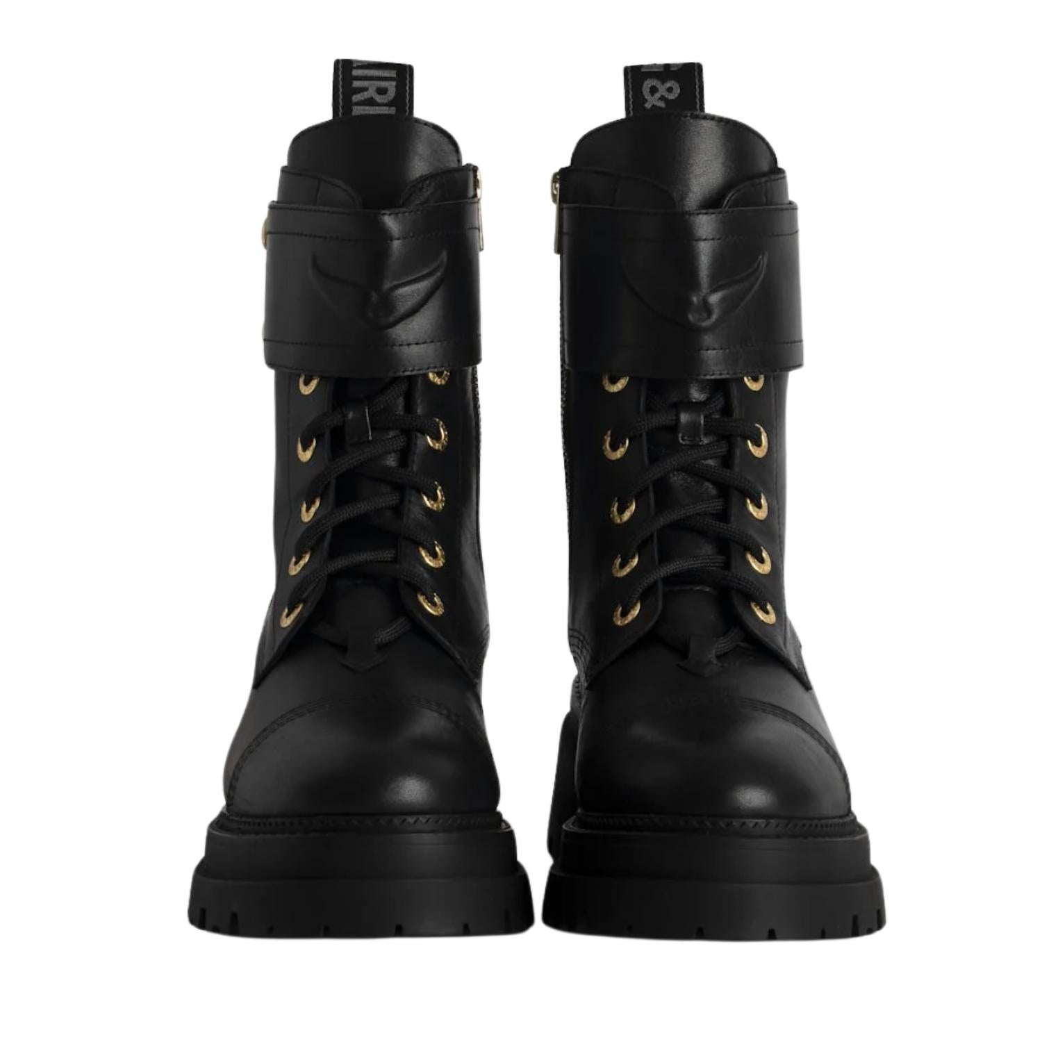 The moto boot trend is here to stay and we especially love this style. Zadig & Voltaire Joe Ride Semi-Shiny Calfskin Boots Calfskin in Noir High-rise ranger boots Smooth black leather Inner zip closure and laces Strap adorned with an embossed smooth leather wing at the front Textile tab signed Zadig & Voltaire at the back Tonal stitching and gold signature metal wings at the back Treaded sole Heel height 3" US 8.5: EU 39 Made in Portugal