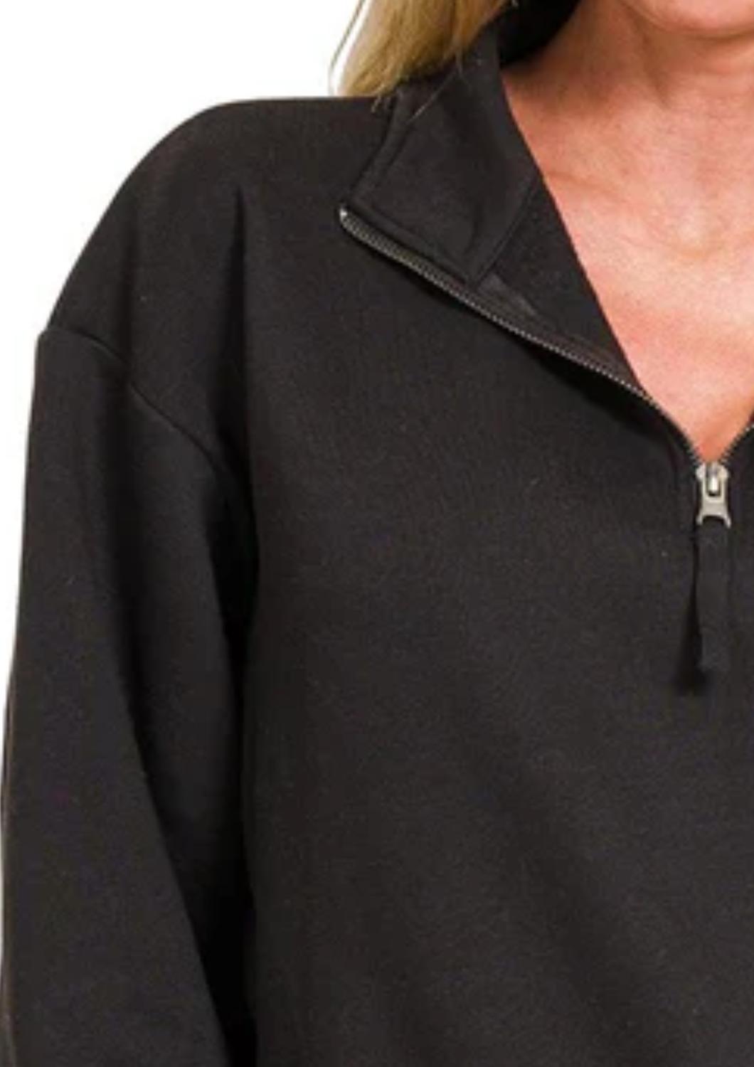 Cooler temps call for layering and we love this adorable sweatshirt for all the obvious reasons. Elevate your casual wardrobe with the Black Half Zip Fleece Sweatshirt by Zenana. This comfortable piece features long sleeves and a V-neck, crafted from a cotton blend composed of 60% cotton and 40% polyester. Garment length is a chic 22 inches, perfect for versatile styling. Closure: Zip closure. Total body length: 22", Bust: 45" approx. Measured from small.