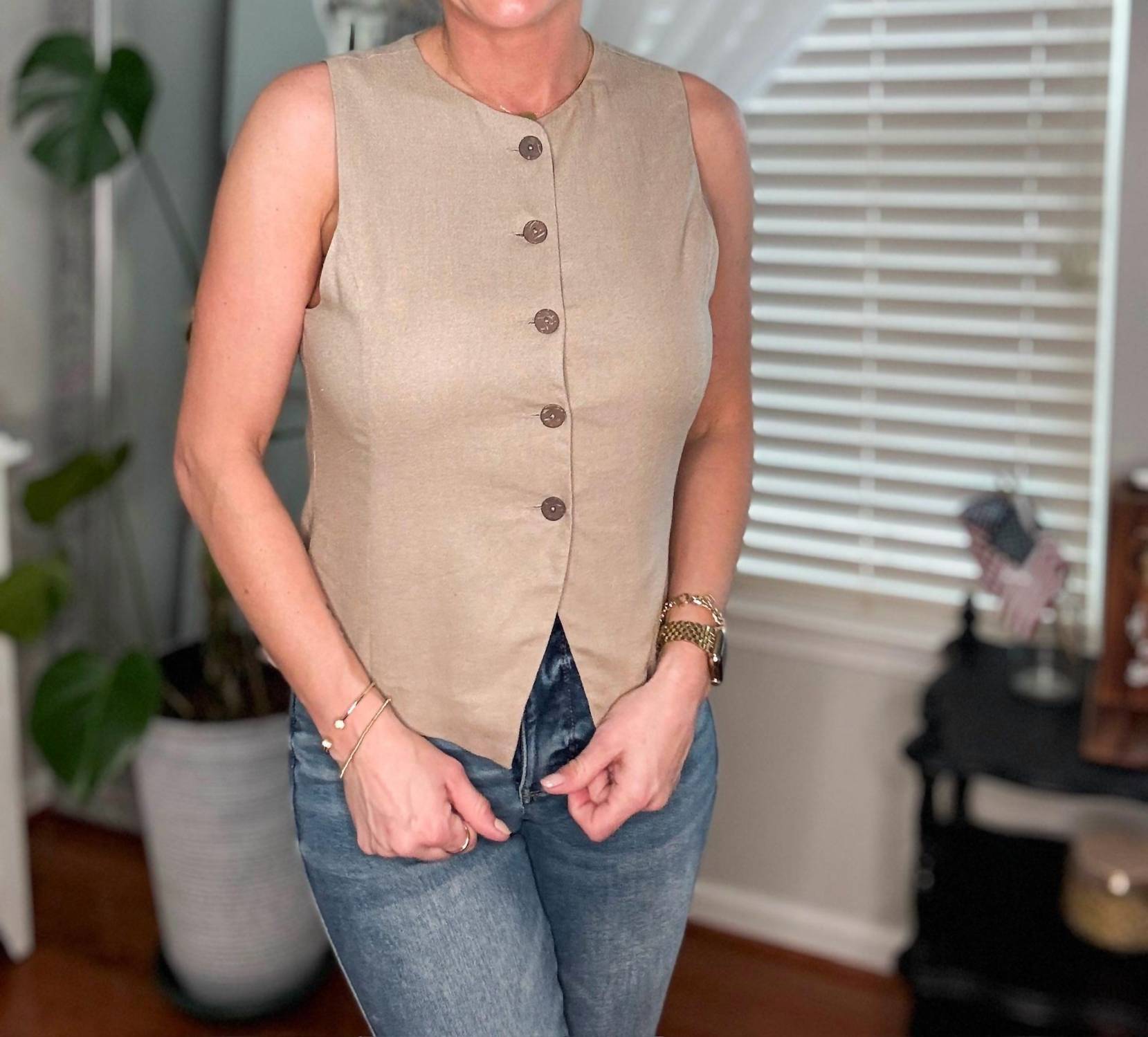 ZENANA's Linen Button Vest in Light Mocha is an elegant addition to any business casual wardrobe. This sleeveless vest features a crewneck and a functional button closure, adding sophistication to your springtime travel outfits. It is crafted from a blend of 12% linen, 83% rayon, and 5% cotton with a 100% polyester lining, ensuring both comfort and style. Made with imported materials, this solid vest perfectly complements any wardrobe without the need for pockets.