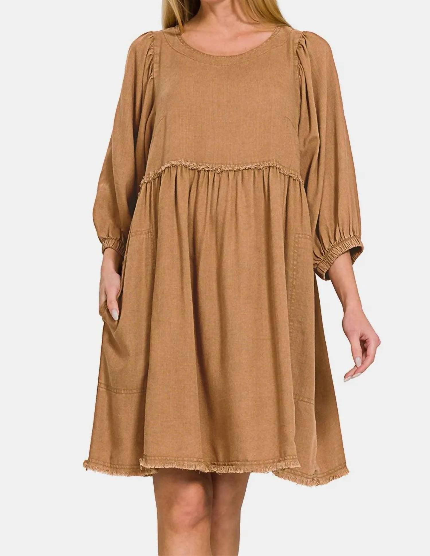 Just add a cute little clutch and a matching heel for the perfect event look. The Washed Linen Pleated Puff Sleeve Babydoll Dress by ZENANA in Deep Camel offers a stylish and versatile look for women. Featuring three-quarter sleeves and a boatneck, this dress is made from a linen blend composed of 25% linen and 75% rayon. Crafted in Cambodia, it has a ruched and pocketed design, adding practicality to its romantic silhouette. For care, machine wash cold and tumble dry low. Available sizes include S (Bust 34-36 in, Waist 26-28 in, HIP 36-38 in), M (Bust 37-38 in, Waist 29-31 in, HIP 39-41 in), and L (Bust 39-40 in, Waist 32-33 in, HIP 42-43 in).