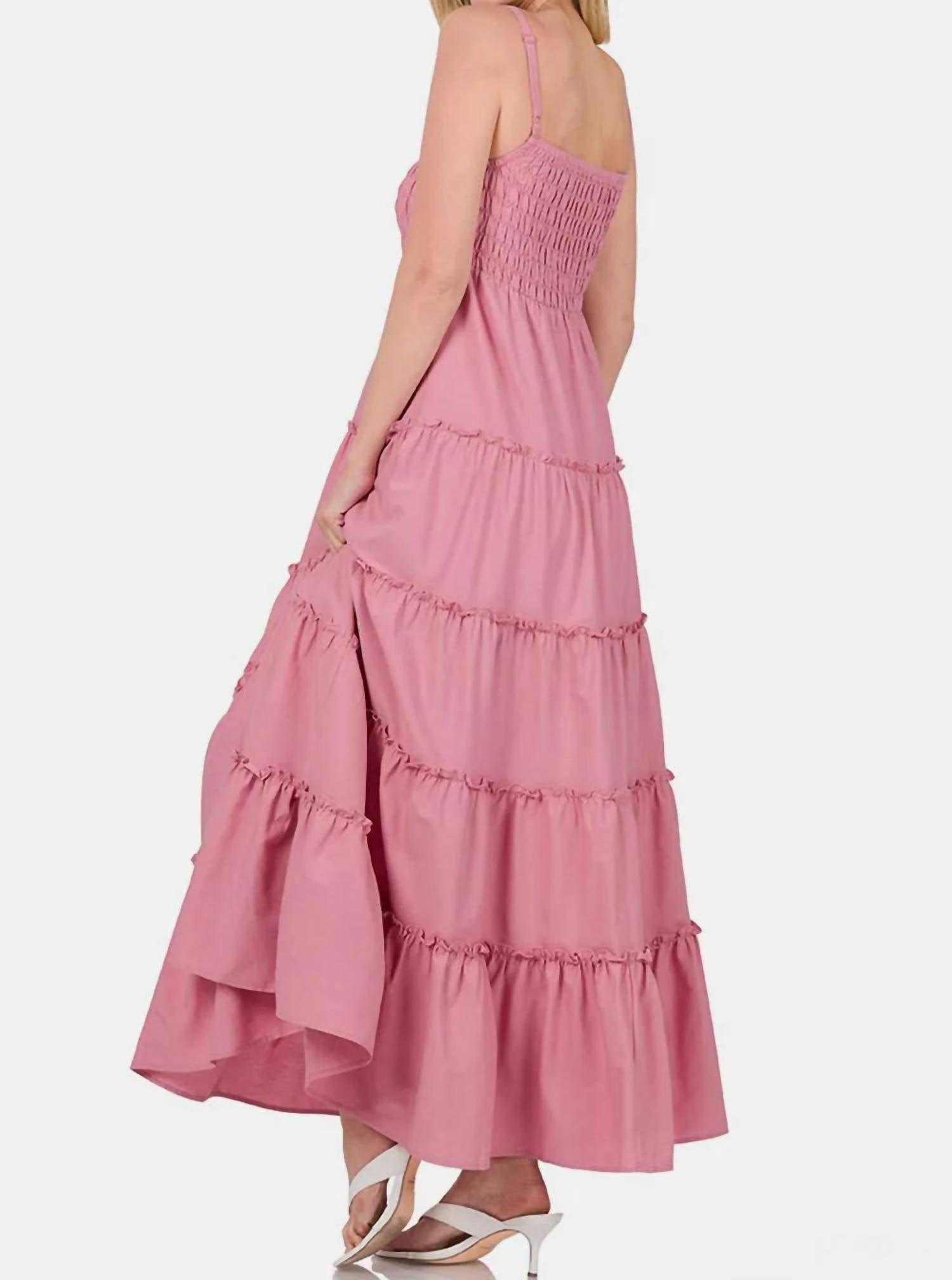 Introducing the Woven Smocked Tiered Cami Maxi Dress by ZENANA, a bohemian-inspired piece in a charming Ltrose color. This maxi dress features spaghetti straps and is crafted from a cotton blend with 55% cotton and 45% rayon, offering a flowing and flattering silhouette with moderate stretch. Designed with a smocked bodice and a tiered skirt, it has a pull-on closure type and showcases effortless elegance. Care for this imported dress easily by machine washing cold and tumble drying on low. Available in sizes S to XL, catering to various body measurements for a perfect fit.