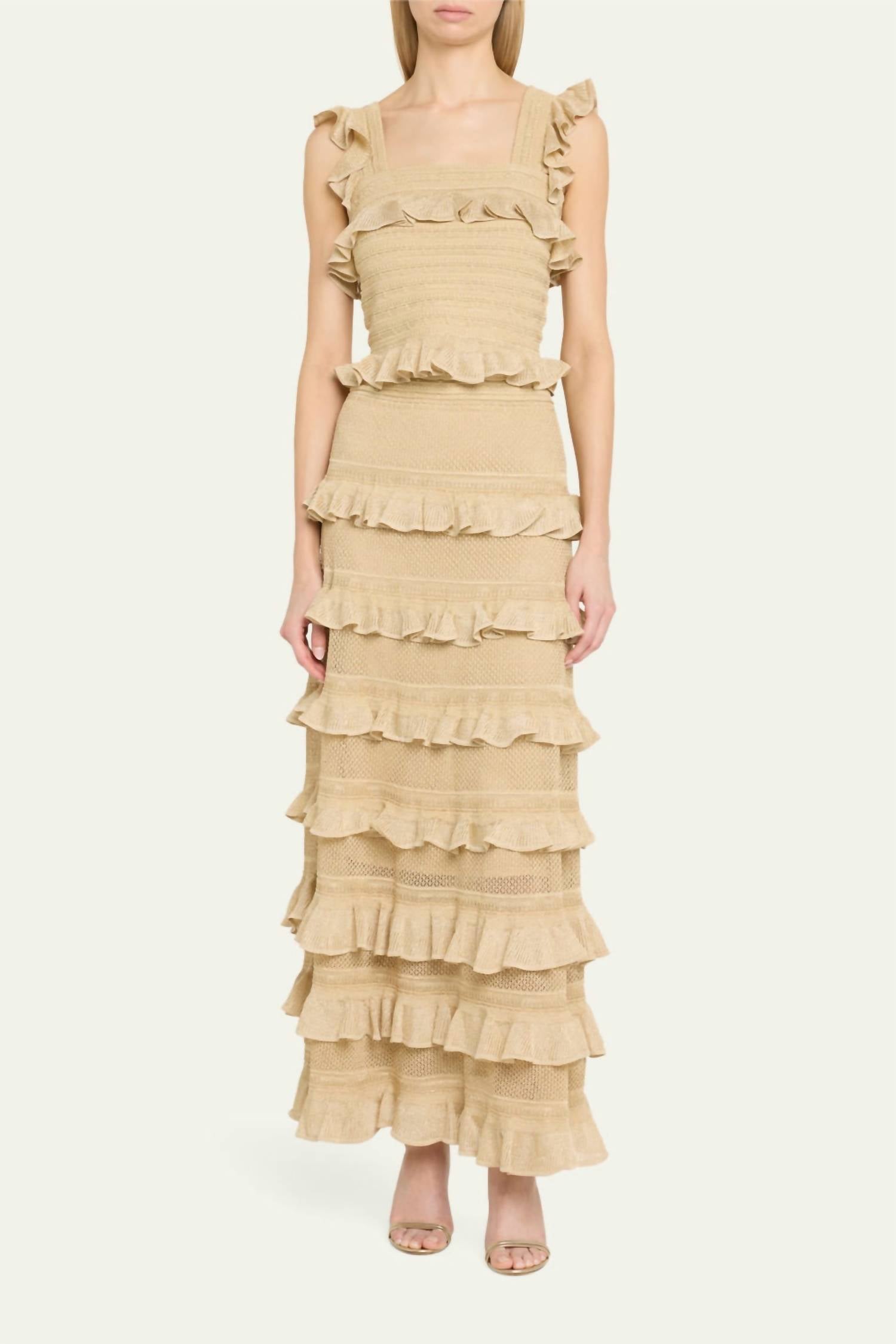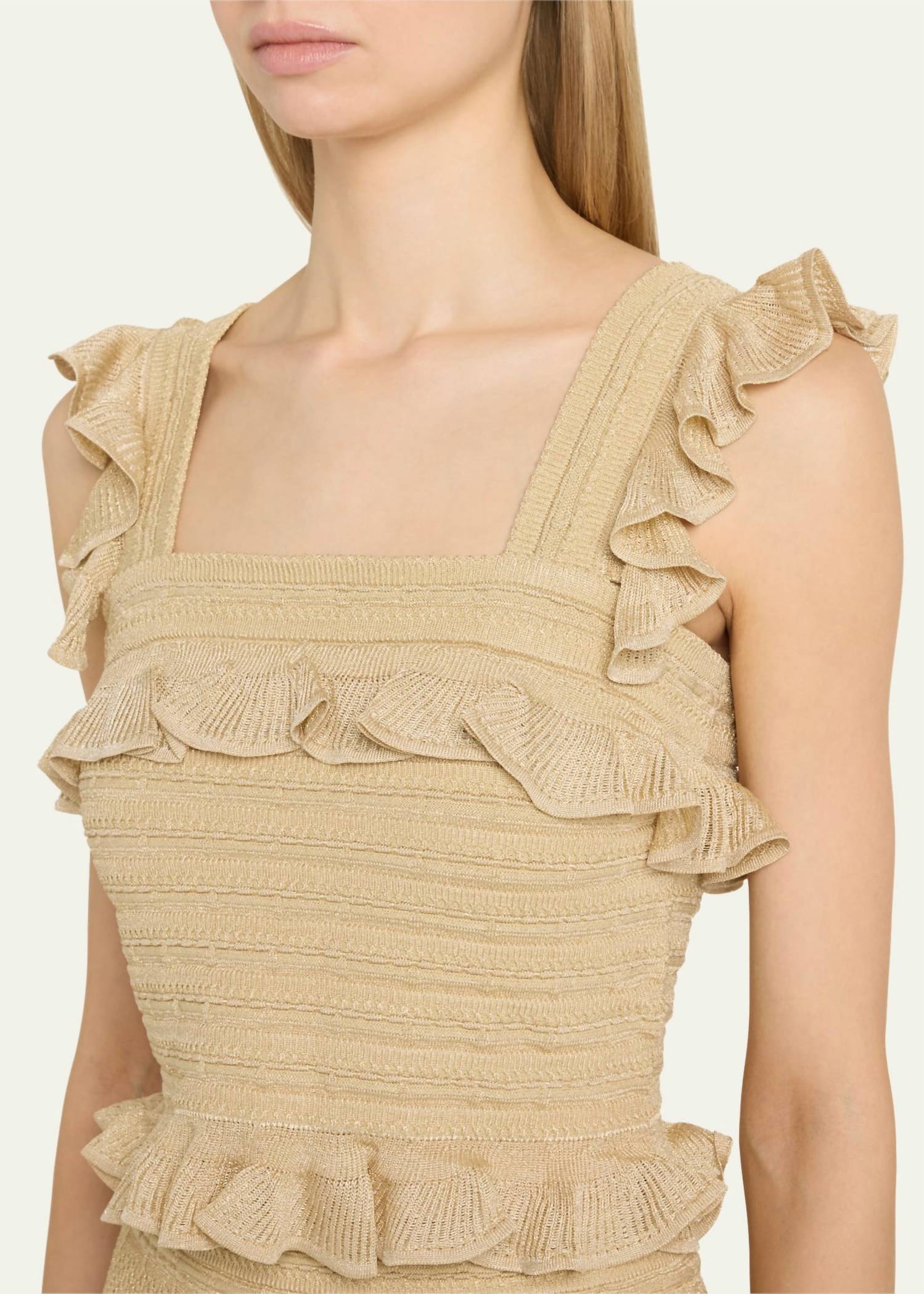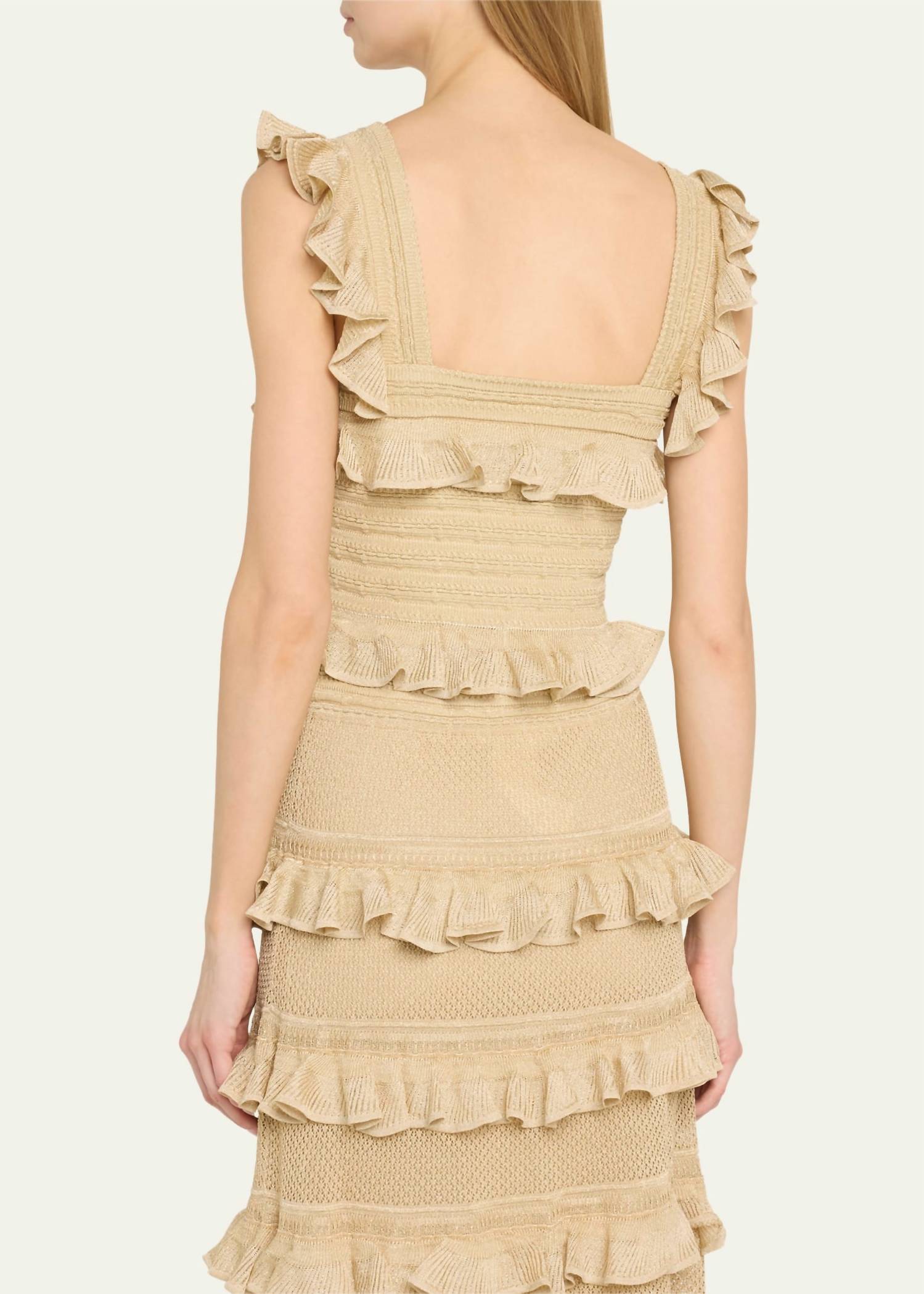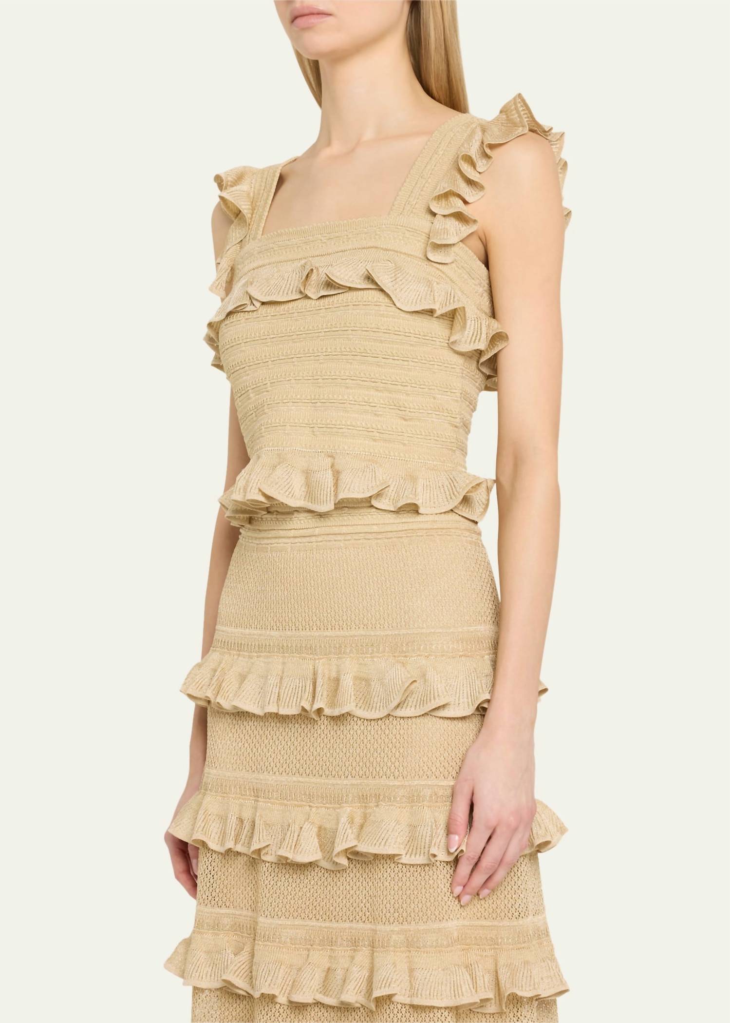 Throw this on with your favorite blazer for a more polished look. Elevate your evening wear with the Illuminate Lace Frill Cami Top by Zimmermann, an exquisite piece in metallic gold perfect for special occasions. This sleeveless cami is crafted from a luxurious blend of 74% Viscose, 22% Polyamide, and 4% Polyester, featuring a square neckline and ruffled lace knit detail throughout. Designed in a pull-on style, this top offers a textured pattern that embodies quiet luxury. Embrace its true-to-size fit for a striking addition to your wardrobe, ideal for summer nights and New Year's Eve events.