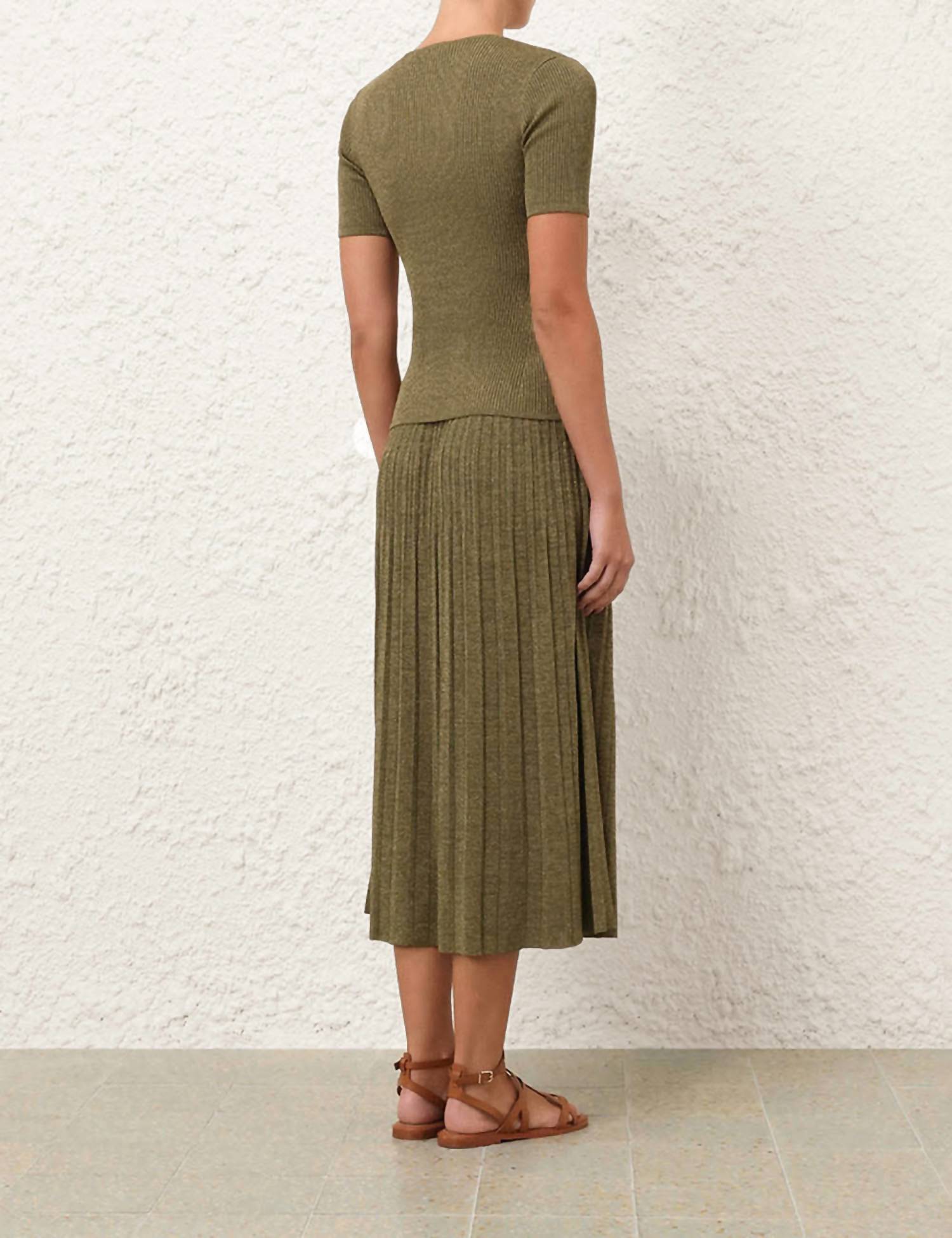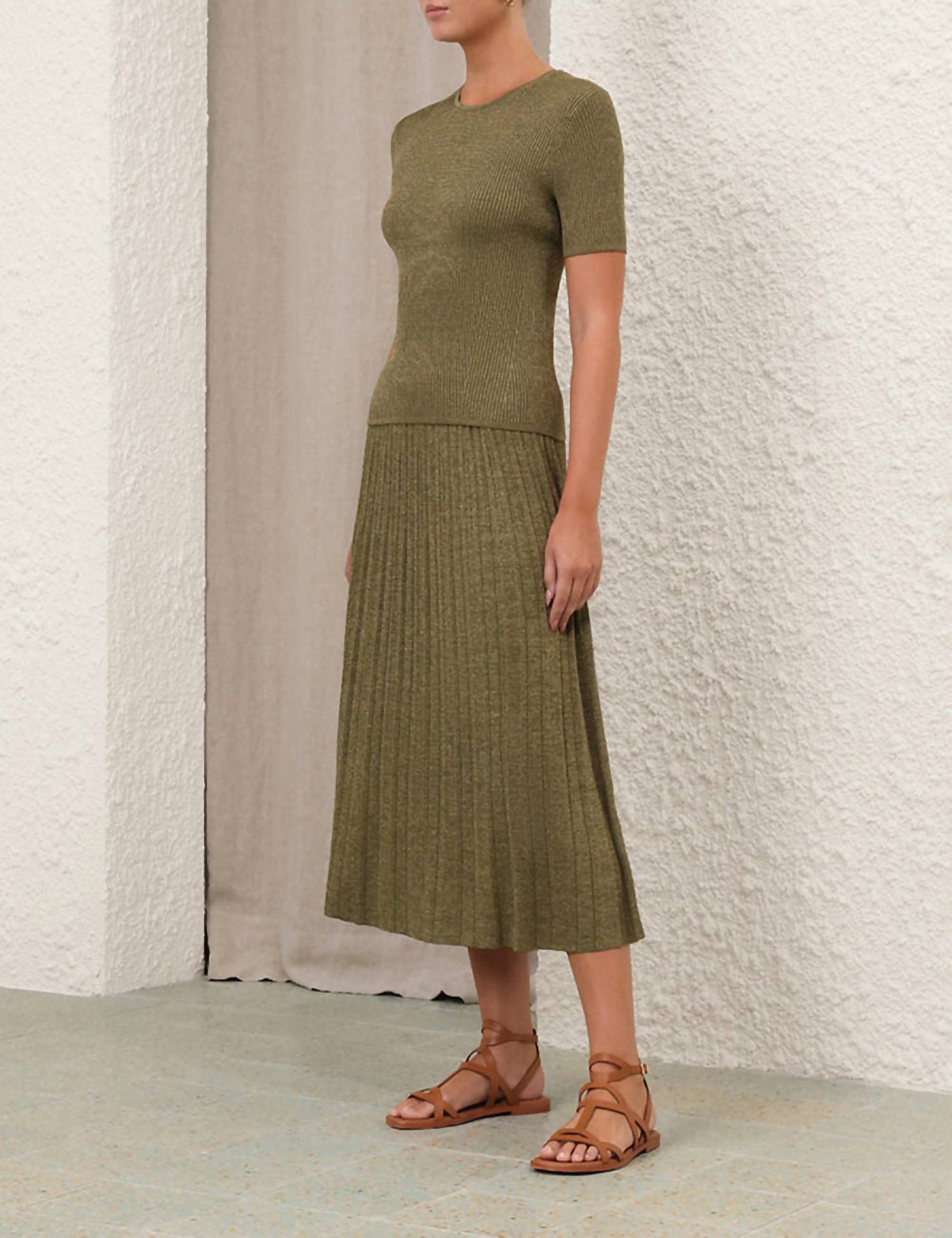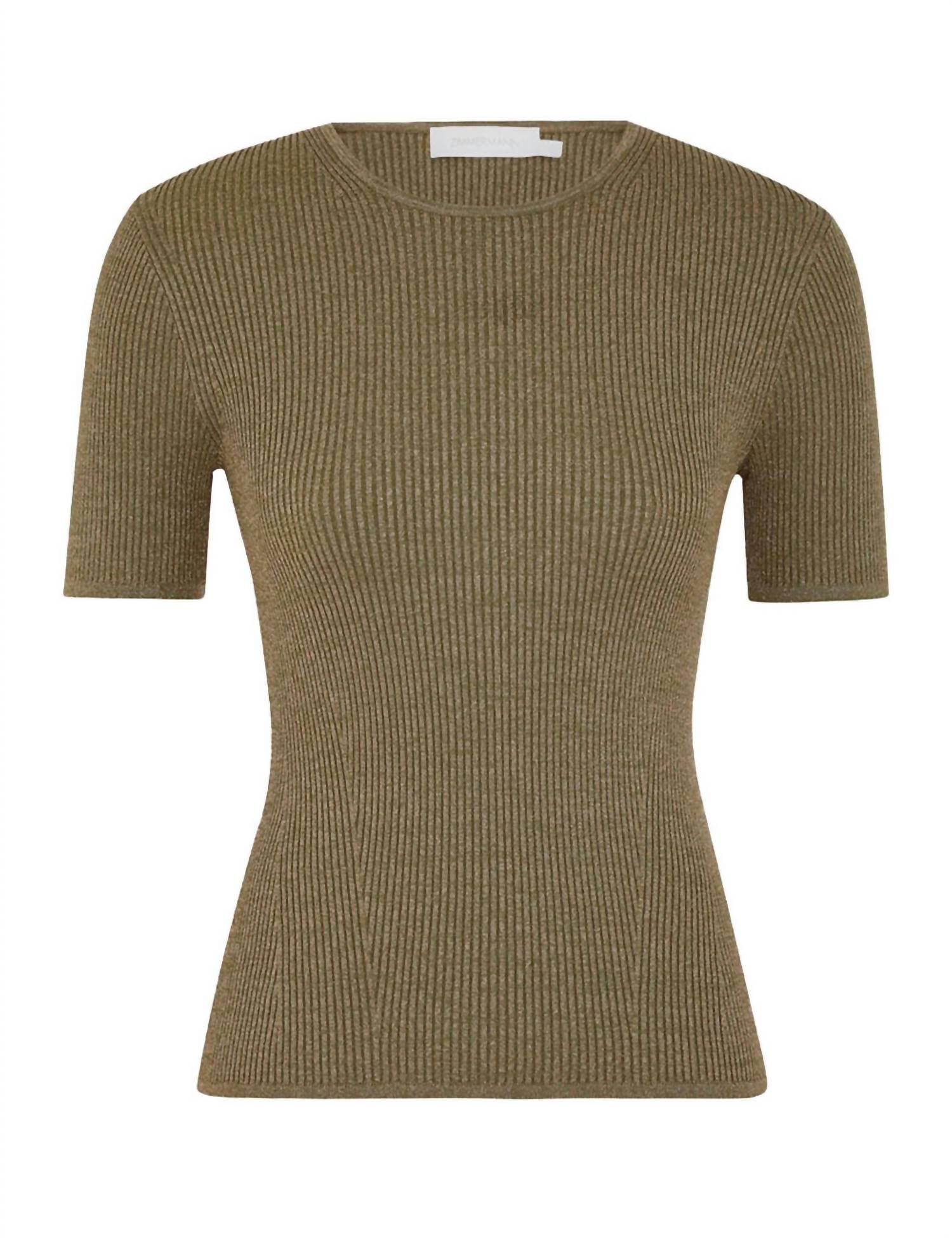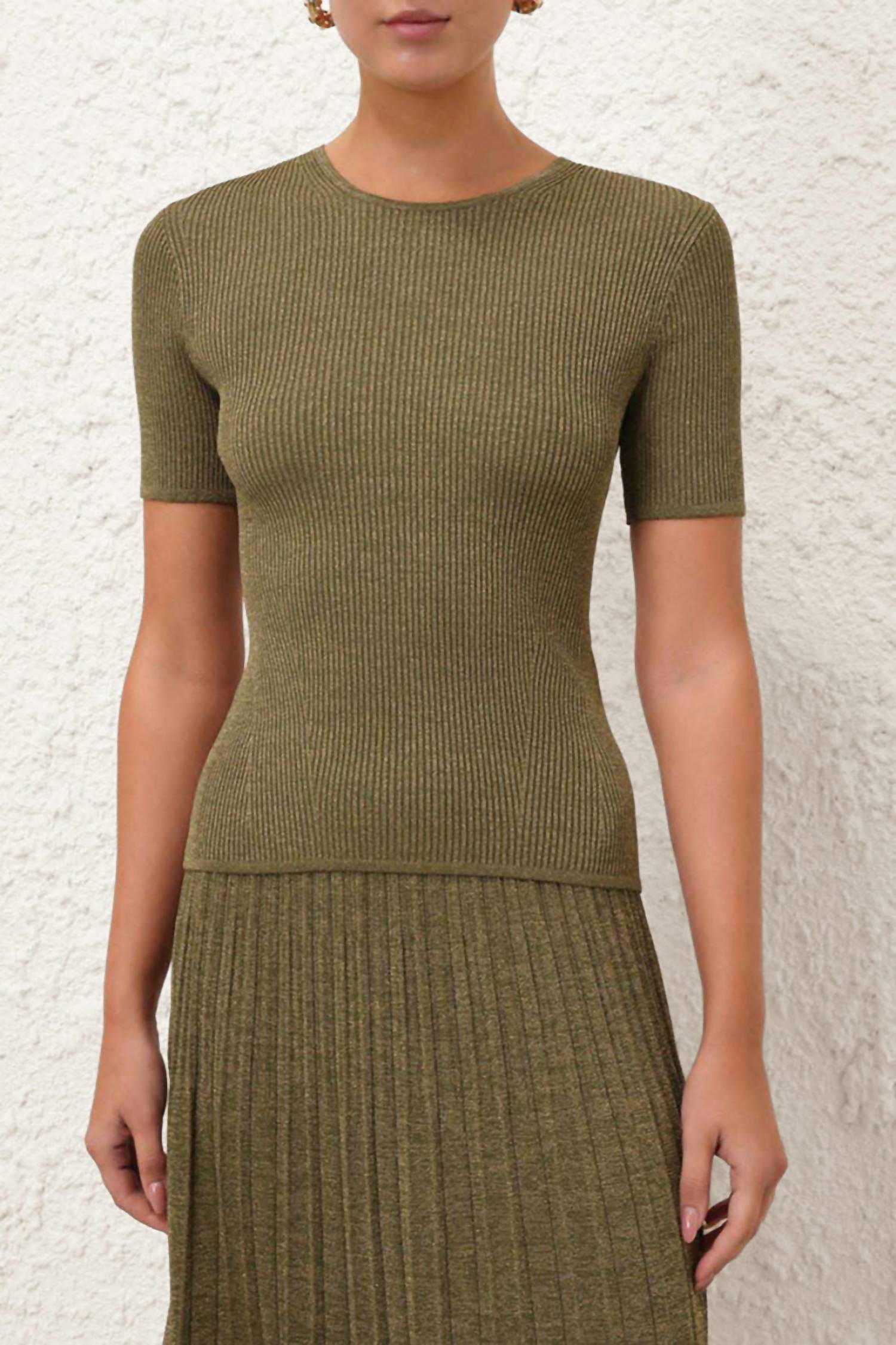 Look no further, you just found your perfect tee! Introducing the Wylie Rib T-Shirt by Zimmermann, a stylish choice for your wardrobe in an eye-catching Dusty Olive-Gold. This crewneck tee showcases short sleeves with a trendy tie-dye pattern, making it perfect for summer or music festivals. Crafted from a luxurious blend of 64% Viscose, 29% Polyamide, and 7% Metallized Fiber, it offers a comfortable true-to-size fit. Closure: Pull on.
