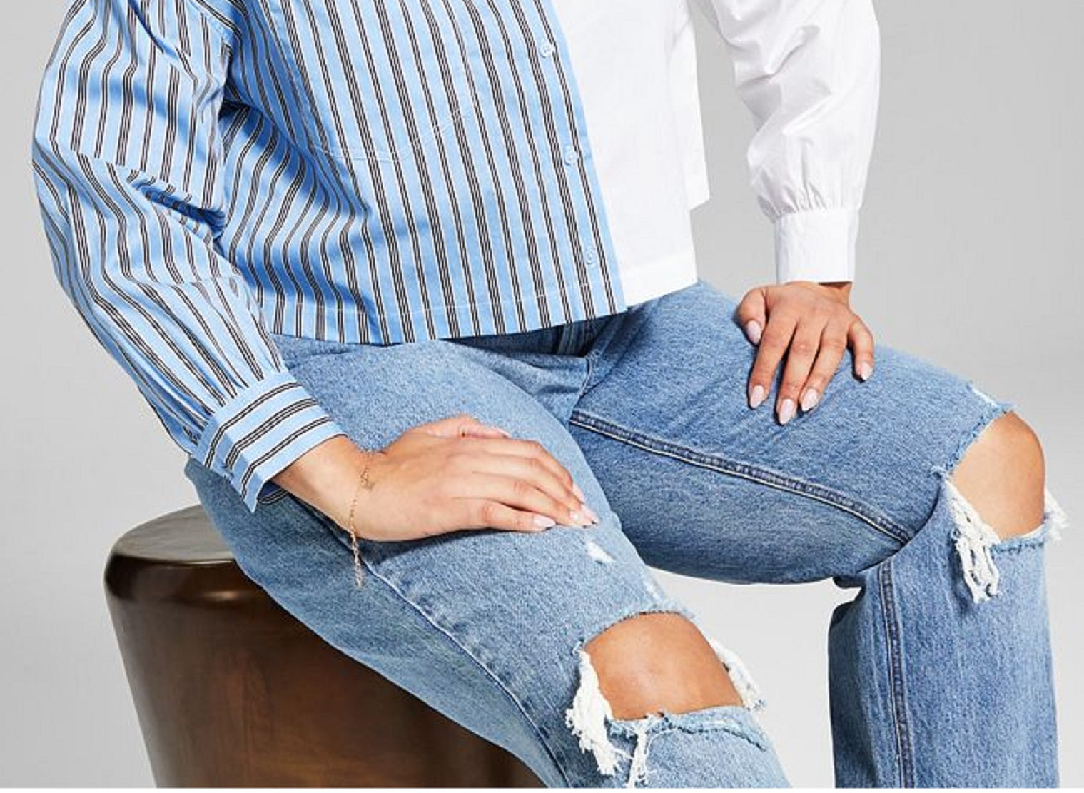 A modern take on the button-up with a two-toned design and cropped fit| this comfortable cotton plus size look by And Now This is perfect for off-duty days.| Point collar; button-front closures| Patch pocket at chest| Drop shoulder long puff sleeves; buttoned cuffs| Length 21.75 for size 2X| 100% cotton