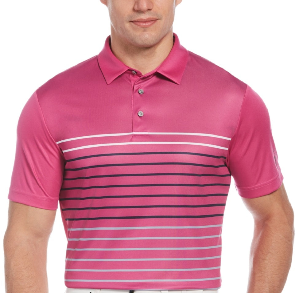 Update your seasonal golf attire with this fashionable and functional PGA Tour golf polo. A high contrast stripe print pops for a fresh look on or off of the course and Moisture Wicking technology helps you stay dry and comfortable. | Polo collar| Three-button placket| Stretch shoulder seams| Wicking fabric helps evaporate moisture| UPF 15 sun protection| Polyester